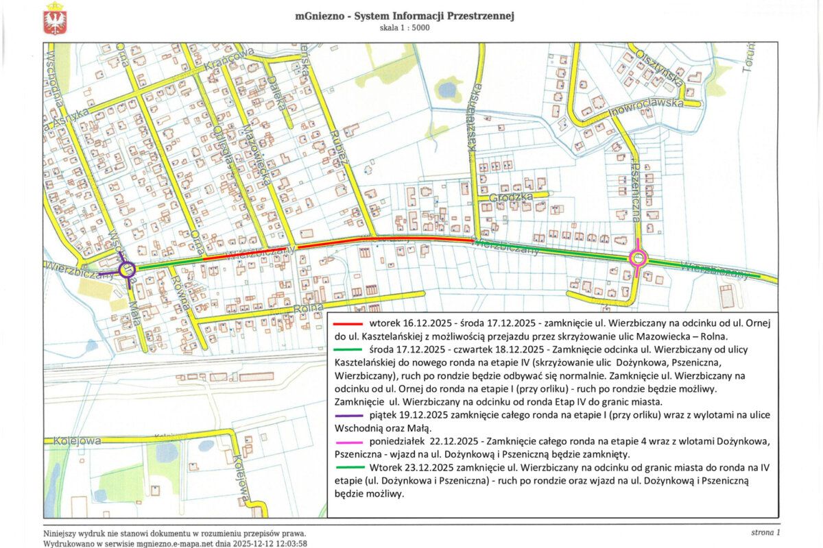 W ramach rozbudowy ul. Wierzbiczany w Gnieźnie, od 17 marca do 16 maja 2025 roku zostanie zamknięty dla ruchu odcinku od skrzyżowania z ulicą ul. Pszeniczną i Dożynkową do granic miasta.