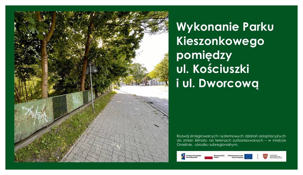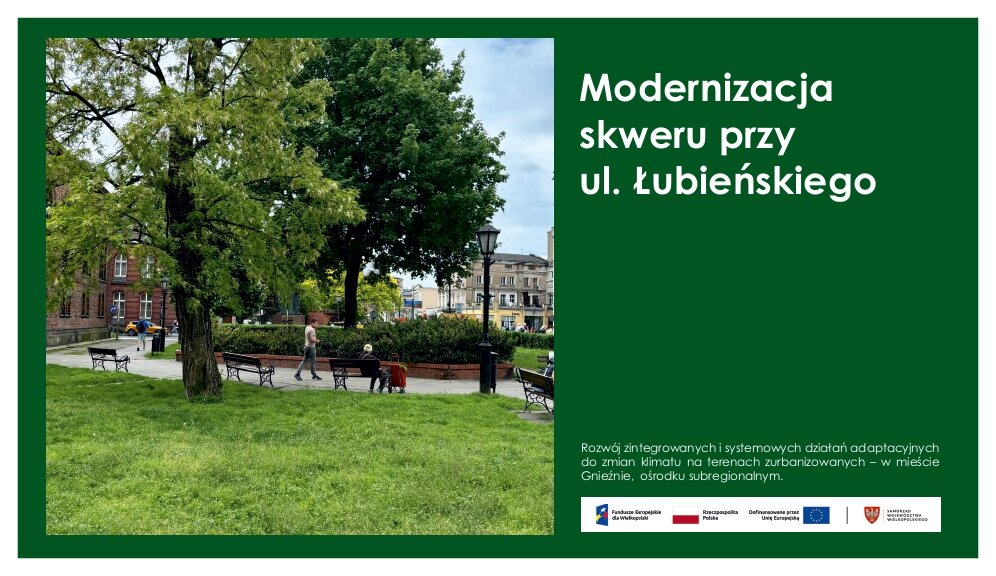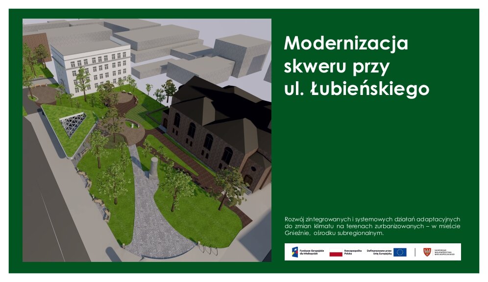 - Modernizacja skweru przy ul. Łubieńskiego. Dziś to jeden z centralnych punktów miasta. Skwer obok dawnego kościoła garnizonowego i pomnika św. Wojciecha dziś nie prezentuje się już korzystnie. Przejdzie on metamorfozę. Alejki zostaną wymienione na takie z przepuszczalnego materiału, zmieni się też ich bieg. Powstanie tutaj automatyczna toaleta i nowa wiata przystankowa, która będzie pokryta zielenią.