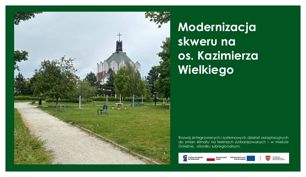 - Modernizacja skweru na os. Kazimierza Wielkiego. Otaczający w części kościół skwer również ma przejść metamorfozę. Tworząca alejki spacerowe kostka ma zostać rozebrana i wymieniona na przepuszczalny materiał, wymieniona ma zostać także siłownia zewnętrzna, a nowością będzie założenie w tym miejscu „ogrodu społecznego”, który ma integrować mieszkańców, pozwalać im się spotykać.