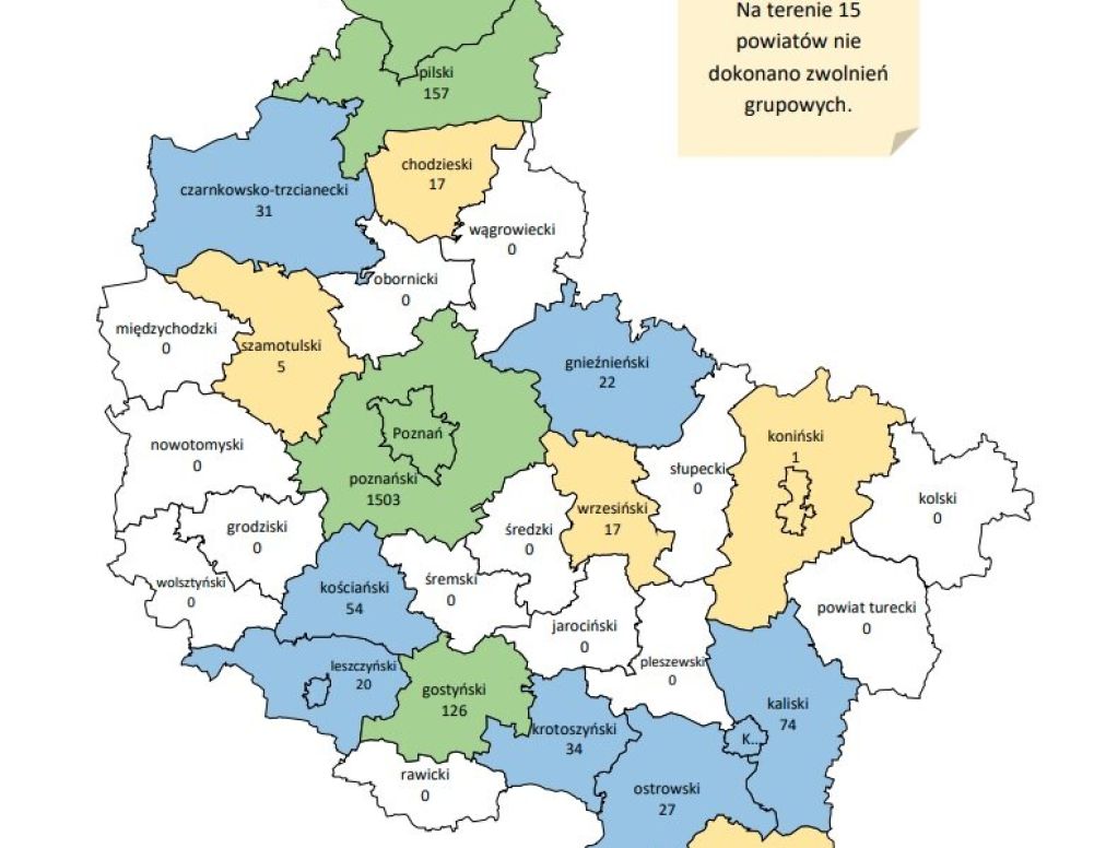Wielkopolski Urząd Pracy w Poznaniu (WUP) zaprezentował dane statystyczne dotyczące zwolnień grupowych w naszym województwie w 2024 roku. Ogółem wielkopolskie firmy zgłosiły w ubiegłym roku do powiatowych urzędów pracy zamiar zwolnienia aż 3768 osób. To prawie o 700 osób więcej niż miało to miejsce w 2023 roku. Ostatecznie jednak pracę w ten sposób straciły 2143 osoby (rok wcześniej 2312). Jak informuje WUP, najwięcej zwolnień grupowych dokonano w miesiącach lutym, marcu i lipcu. Ogólnie, w roku ubiegłym, z 35 powiatów Wielkopolski w 15 nie dokonano żadnych zwolnień grupowych, jednak do tego grona nie zalicza się powiat gnieźnieński. W 2024 roku w tej formie rozwiązania stosunku pracy zwolniono tutaj 22 osoby. Gorsza sytuacja była w powiatach czarnkowsko-trzcianeckim, kościańskim, leszczyńskim, krotoszyńskim, ostrowskim, kaliskim i Kaliszu (miasto na prawach powiatu), a najwięcej w gostyńskim (126 zwolnień), poznańskim (1503), złotowskim (50) i pilskim (157). Najczęściej zakłady zwalniały do 19 pracowników (w 2024 roku było ich 64), ale aż 5 zakładów w Wielkopolsce zwolniło 100 i więcej pracowników. 1025 osób zwolniono w branżach: handel hurtowy i detaliczny; naprawa pojazdów samochodowych i motocyklowych, 664 z branży przetwórstwa przemysłowego, a 188 w branży działalności profesjonalnej, naukowej i technologicznej. W transporcie i gospodarce magazynowej prace grupowo straciły 162 osoby. „Z obserwacji wielkopolskiego rynku pracy wynika, że liczba pracowników zgłoszonych do zwolnienia jest wyższa niż faktycznie zwolnionych, co jest pozytywną, stałą tendencją od kilku lat. Jest to wynikiem m.in. rezygnacji przez niektórych pracodawców, w części lub w całości, z pierwotnych zamierzeń przeprowadzenia redukcji zatrudnienia. Należy jednak podkreślić, że z uwagi na terminy wypowiedzeń w ramach zwolnień grupowych, dane dotyczące analizowanego okresu zawierają m.in. zwolnienia, które zostały zgłoszone jeszcze w 2023 r. i są kontynuowane w 2025 r.” – komentuje podane dane WUP w Poznaniu.