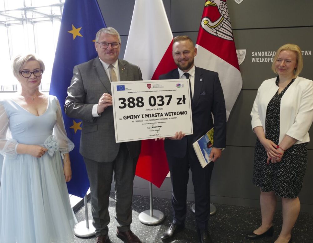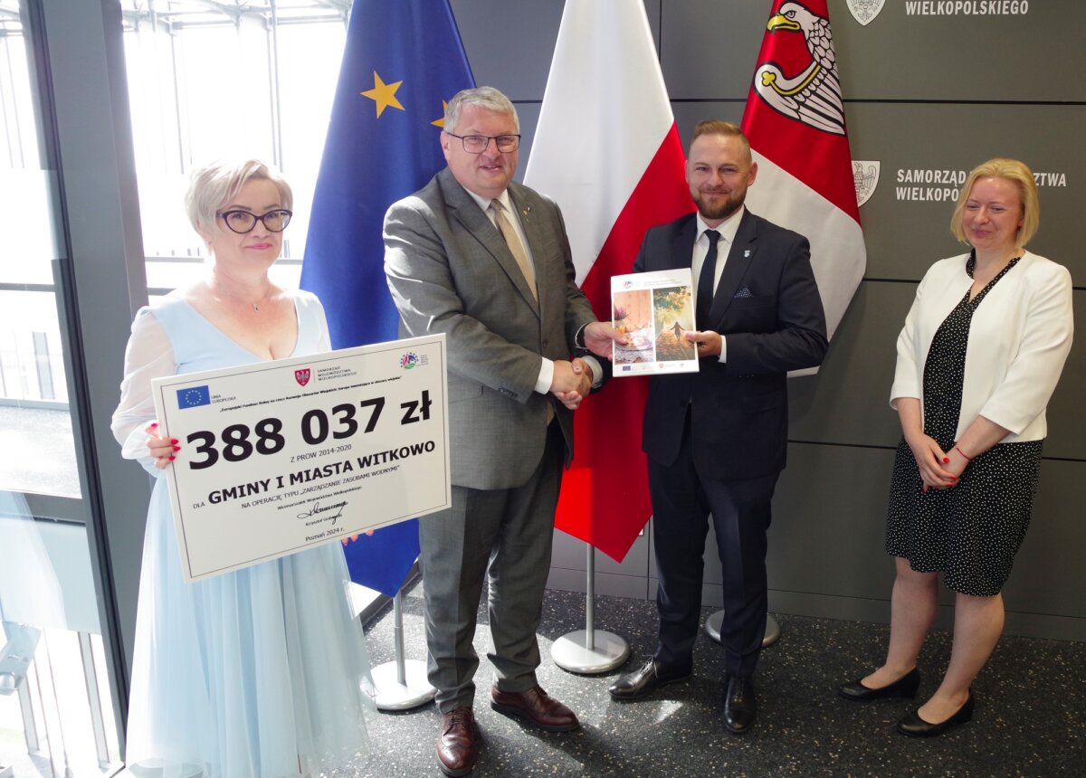 Gmina Witkowo otrzymała dotację w wysokości 388 037 zł na zadanie: Odbudowa ziemnego stawu w miejscowości Mąkownica, gm. Witkowo. Symboliczny czek odebrał od wicemarszałka Krzysztofa Grabowskiego burmistrz Witkowa Krzysztof Szoszorek.