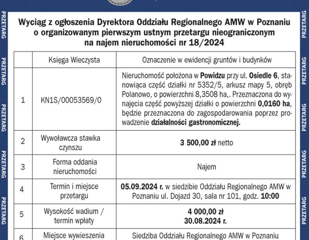 Wyciąg z ogłoszenia Dyrektora Oddziału Regionalnego AMW w Poznaniu o organizowanym pierwszym ustnym przetargu nieograniczonym na najem nieruchomości nr 18/2024
