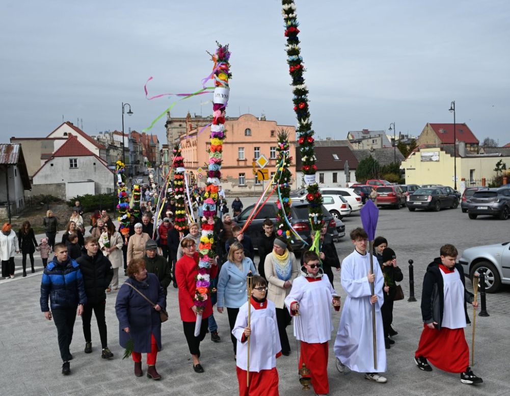 Podobnie jak w latach ubiegłych imponujących rozmiarów palmy wierni mogli podziwiać podczas procesji oraz mszy świętej w parafii pw. św. Trójcy w Strzelnie. Krótko przed procesją wszyscy wierni zebrali się na strzeleńskim rynku. Poświęcenia palm przy śpiewie pieśni Chrystus Wodzem, Chrystus Królem dokonał proboszcz parafii ks. Jan Kwiatkowski. Procesja z palmami w Strzelnie jak zwykle nie była tylko obrzędem wielkanocnym, ale także stała się pięknym widowiskiem, które zgromadziło zarówno wielu widzów jak i twórców palm. Po poświęceniu palm ruszyła procesja przy śpiewie pieśni Hosanna Synowi Dawidowemu zaintonowanej przez organistę parafii Macieja Leszczyńskiego. Procesję z rynku do kościoła zabezpieczała miejscowa policja. Przypomnijmy, że do takiej pięknej tradycji i do reaktywowania starych kujawskich zwyczajów wykonywania palm kilka lat temu postanowił zachęcić wiernych nieżyjący już proboszcz strzeleńskiej parafii ks. Otton Szymków namawiany usilnie przez ówczesnego sołtysa Sławka Dolnego Jana Bartoszaka. Od tego czasu minęło już 25 lat. Palmy na procesję w Strzelnie wykonują nie tylko indywidualne osoby, ale także instytucje, poszczególne wsie, szkoły i przedszkola oraz Koła Gospodyń Wiejskich. Wszystkie palmy były okazałe. Po procesji w bazylice odbyła się uroczysta liturgia Niedzieli Palmowej z jej ważnym elementem, czyli Męką Pańską zawartą w Ewangelii wg św. Marka. Kujawskie palmy pozostaną w kościele do Wielkanocy. Później zostaną zabrane do szkół, przedszkoli i wiejskich świetlic, aby tam prezentować kujawską tradycję. Po mszy św. wszystkie delegacje otrzymały specjalne podziękowania od parafii.