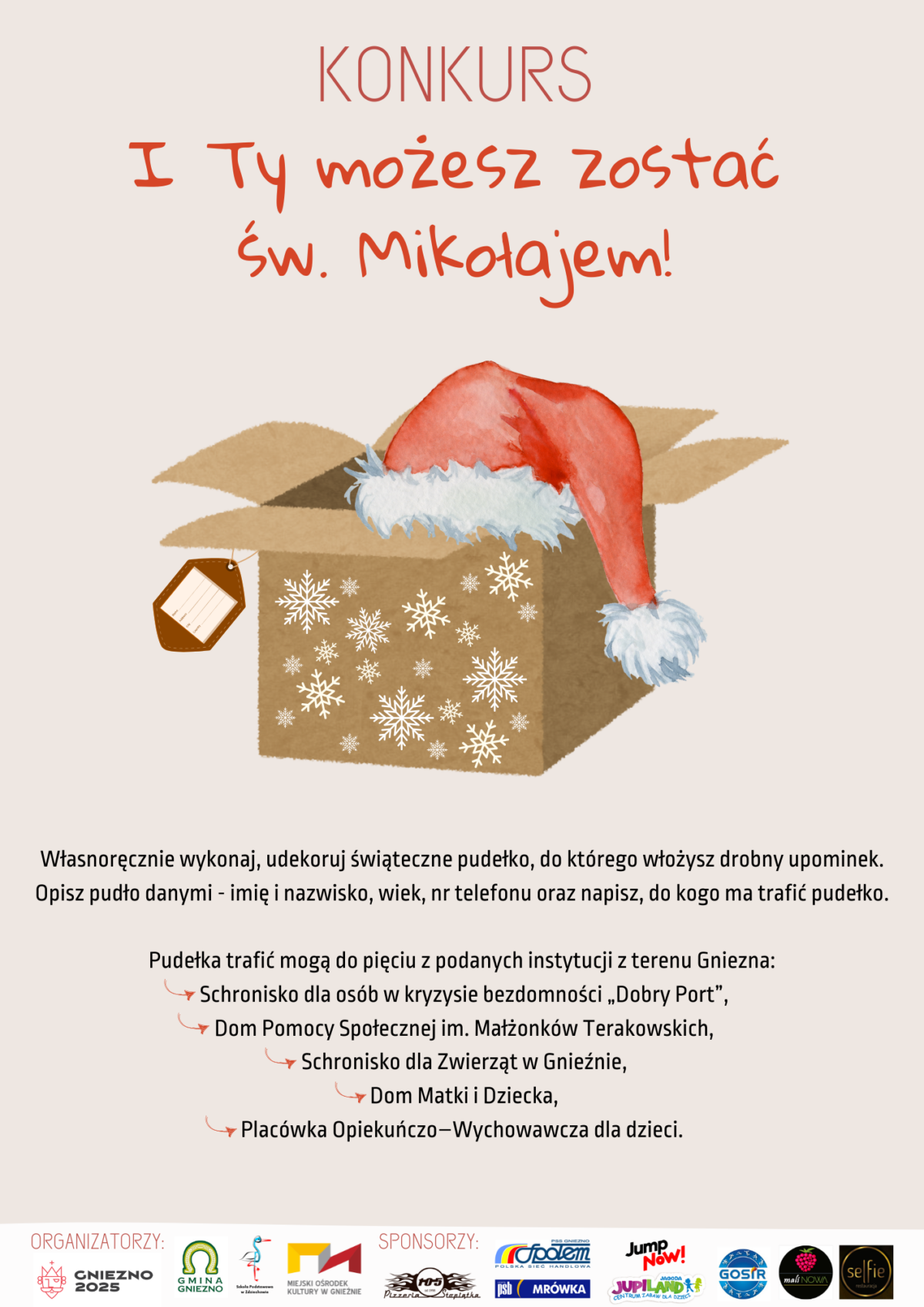 Gmina Gniezno oraz Miasto Gniezno zapraszają na konkurs bożonarodzeniowy pod nazwą „I Ty możesz zostać świętym Mikołajem”, który współorganizowany jest ze Szkołą Podstawową w Zdziechowie oraz Miejskim Ośrodkiem Kultury w Gnieźnie. Tym razem dwa samorządy postanowiły zaprosić swoich mieszkańców do wsparcia osób potrzebujących.