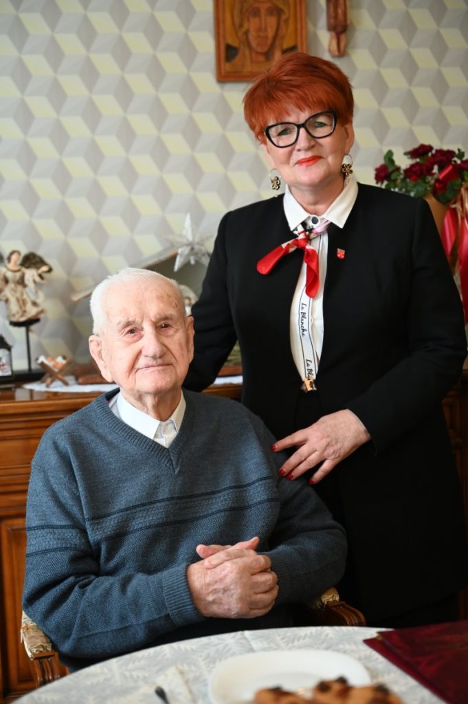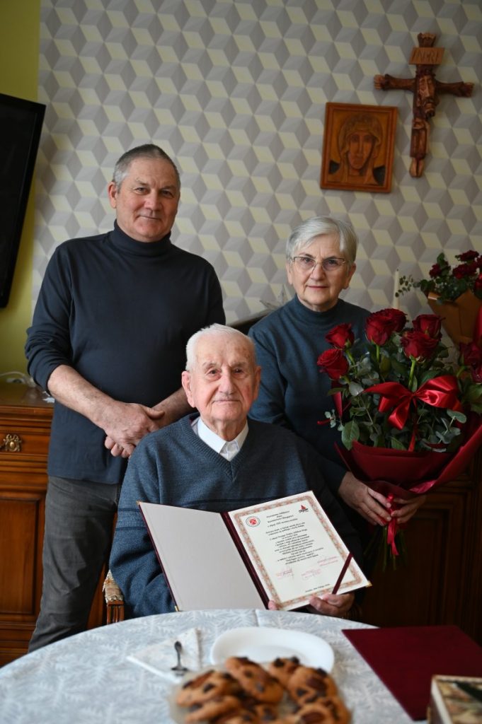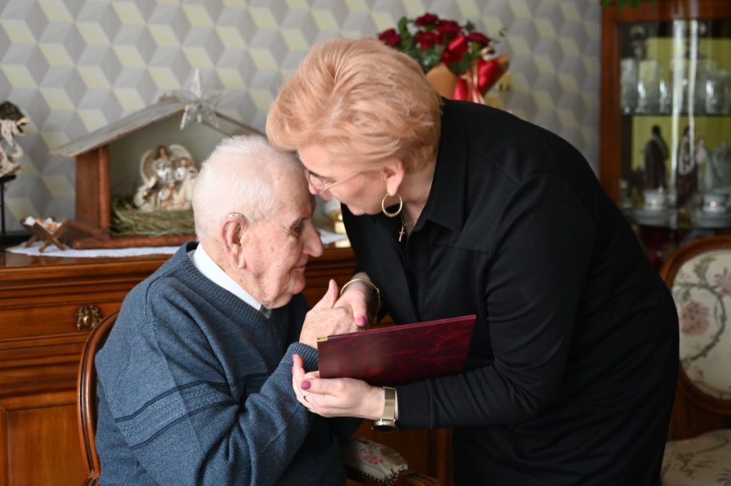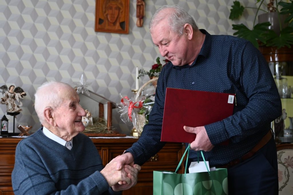 Dokładnie w dniu 102. urodzin Jubilata z życzeniami, bukietem kwiatów i koszem pełnym słodyczy odwiedzili go przedstawiciele władz Strzelna: przewodnicząca Rady Miejskiej Emilia Walkowiak i kierowniczka USC Joanna Stranc oraz sołtys Ostrowa Jan Lewandowski. Po złożonych życzeniach i odśpiewaniu 200 lat wszyscy zaproszeni zostali na jubileuszową kawę z domowymi wypiekami.