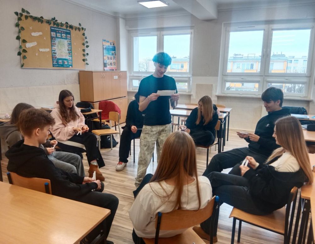 Młodzież miała także okazję spotkać się online z grupą partnerską i wzajemnie odpowiadać sobie na pytania o swoje kraje, szkoły itp. Spotkanie przebiegło w bardzo miłej atmosferze. Uczniowie klasy I TEG, z godnym pochwały zaangażowaniem, zrealizowali też już dwa ćwiczenia projektowe: Wortsalat i Läufer und Schreiber. Ruch oraz uśmiech, który nie schodził z twarzy podczas wykonywania zadań, z pewnością wsparły proces nauki nowych słów, wyrażeń i zwrotów. W ramach tego projektu również planowane jest m. in. spotkanie online z partnerami z innych krajów.