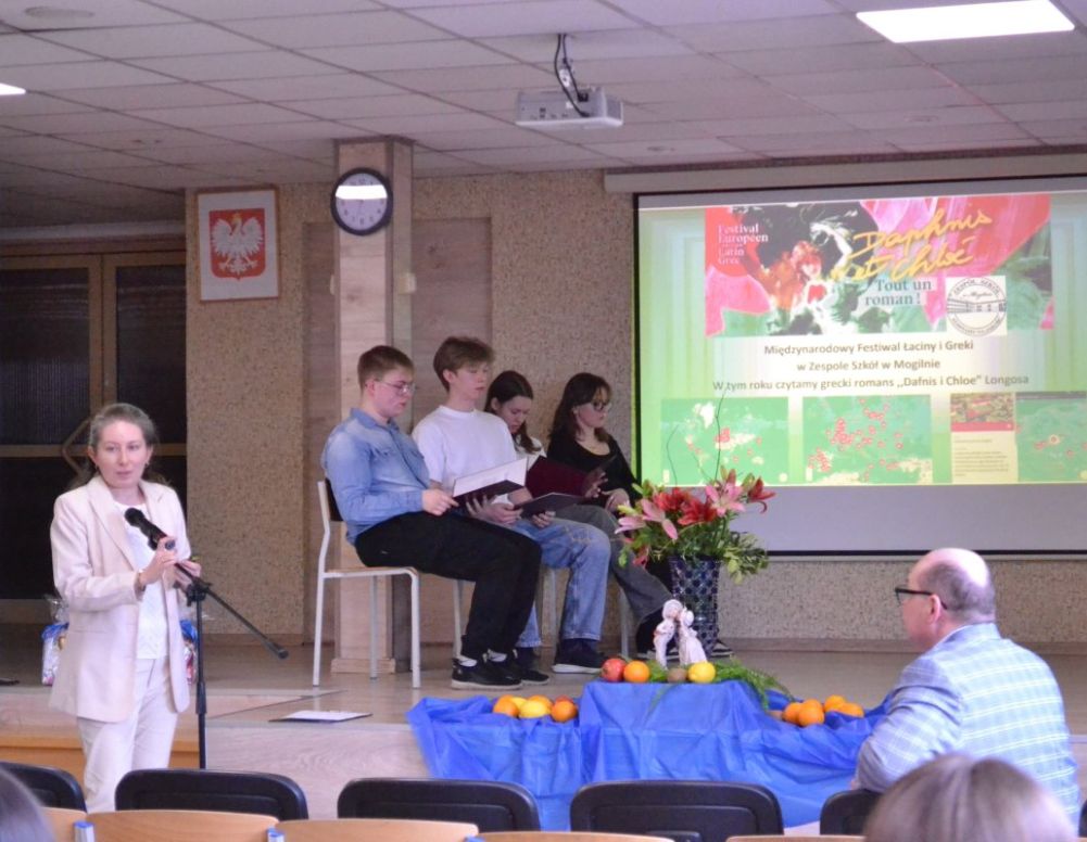 Zespół Szkół w Mogilnie ponownie znalazł się w gronie instytucji biorących udział w Europejskim Festiwalu Łaciny i Greki, inicjatywie koordynowanej w Lyonie i obejmującej szkoły, uniwersytety oraz ośrodki kultury na całym świecie. W centrum tegorocznej edycji znalazło się wspólne czytanie greckiego romansu Longosa Dafnis i Chloe, które w Mogilnie zaprezentowali uczniowie: Amelia Cienguszewska, Magdalena Kaczmarek, Zofia Kasprzyk, Franciszek Matusiak, Zuzanna Moskal, Kornelia Porada oraz Jakub Rachowski.