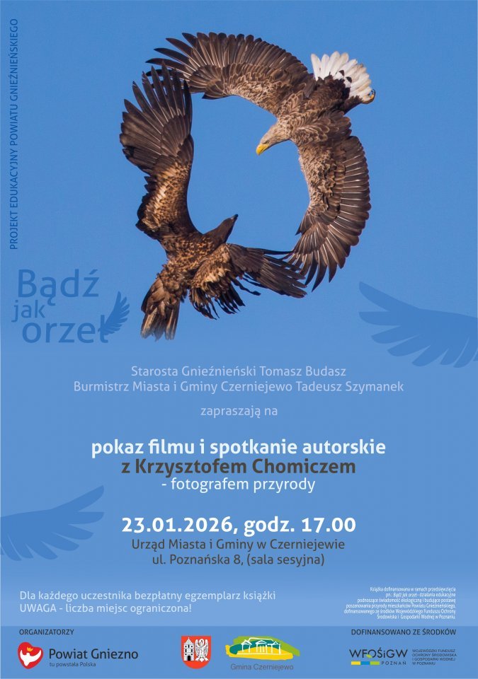 W Czerniejewie szykuje się wyjątkowe wydarzenie dla wszystkich, którzy kochają przyrodę, fotografię i ciekawe opowieści. Już w piątek, 23 stycznia o godzinie 17. w sali sesyjnej Urzędu Miasta i Gminy Czerniejewo odbędzie się spotkanie, które pozwoli zajrzeć w świat natury widziany okiem Krzysztofa Chomicza, filmowca i fotografa, pasjonata historii i przyrody. Na wydarzenie zapraszają Tomasz Budasz, starosta Powiatu Gnieźnieńskiego i Tadeusz Szymanek, burmistrz Miasta i Gminy Czerniejewo.