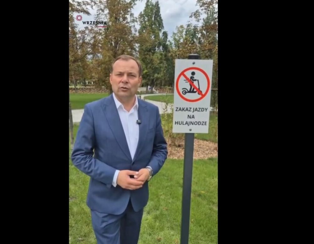 Września zaczęła od edukacji. Polskie miasta zalewają elektryczne hulajnogi, które same w sobie nie są niczym złym. Złe są natomiast zachowania ich kierowców, którzy nie stosują się do przepisów – jeżdżą przez pasy, po chodnikach, nie ustępują pierwszeństwa. Tak jest też we Wrześni. Tamtejsza Straż Miejska rozpoczęła zatem cykl edukacyjny, gdzie w dynamicznych filmikach municypalni przypominają, jak korzystać bezpiecznie i zgodnie z prawem z takiego jednośladu. Mimo to, władze miasta starają się chronić bezpieczeństwo swoich mieszkańców i zarządzeniem wyłączyły możliwość poruszania się takimi pojazdami w zrewitalizowanej części Parku im. Józefa Piłsudskiego. Ta część popularnego zieleńca we Wrześni przeszła metamorfozę i cieszy się ona ogromnym zainteresowaniem mieszkańców. By nie narażać nikogo zdrowia postanowiono, że hulajnogi tam nie wjadą. – Jest to miejsce, w którym mieszkańcy chcą odpocząć, pospacerować. W tym parku przebywa mnóstwo dzieci, osób starszych. Ludzi, którzy chcą mieć chwilę ciszy i spokoju. Niestety, użytkownicy hulajnóg przyjeżdżają tutaj i zrobili sobie tutaj miejsce wyścigów, driftów, niszcząc nawierzchnię świeżo wyremontowanych ścieżek – informuje Artur Mokracki w filmie skierowanym do mieszkańców. W załączonych zdjęciach widać rozjeżdżone aleje, trawniki. – Nie zgadzamy się na to! – podkreślił i przekazał, że zdecydował o wprowadzeniu w tej części parku zakazu. Zarządzenie weszło w życie 12 września.