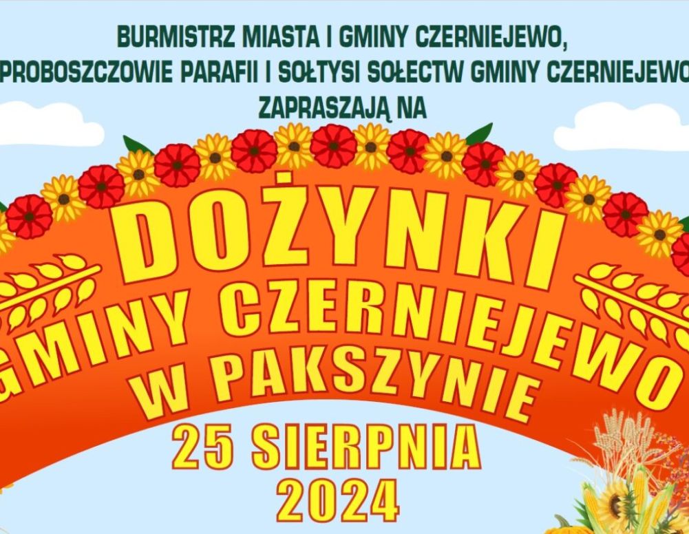 Święto plonów w gminie Czerniejewo odbędzie się w niedzielę, 25 sierpnia. Zwyczajowo już rozpocznie się przejściem dożynkowego korowodu, który wyruszy o godzinie 13:40. Następnie, o godzinie 14. odprawiona zostanie polowa msza święta, a tuż po niej przeprowadzony zostanie tradycyjny obrzęd dożynkowy z udziałem Zespołu Tańca Ludowego Staropolanie – Wielkopolska. Od godziny 16. odbywać się będzie część artystyczna. W programie tegorocznych dożynek przewidziano także losowanie nagród w loterii i ogłoszenie wyników konkursu na najpiękniejszą zagrodę dożynkową. Oczywiście, nie zabraknie także atrakcji dodatkowych, wśród których każdy z pewnością znajdzie dla siebie coś interesującego, to m.in. wystawa maszyn rolniczych, stoiska z rękodziełem, dmuchane zjeżdżalnie, gry, zabawy i animacje dla najmłodszych. I – oczywiście – stoiska z bogatą ofertą gastronomiczną. Wspólne świętowanie zwieńczone zostanie zabawą z zespołem Pagost. Wydarzenie odbywać się będzie przy świetlicy wiejskiej w Pakszynie.