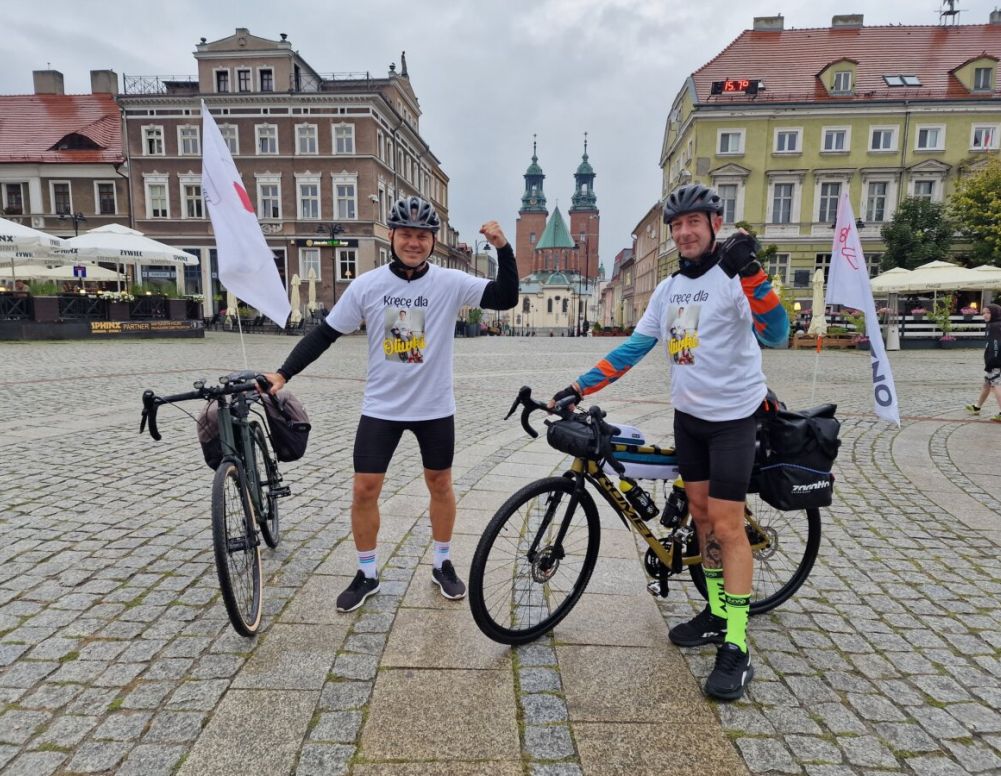 Kolarze wyruszyli z gnieźnieńskiego Rynku o godzinie 18, w niedzielę 14 września. Zanim jednak depnęli mocno w pedały, porozmawiali z nami i przekonali o swojej mocnej motywacji do pokonania trasy, bo aura tego dnia była deszczowa, a przed nimi noc i jazda pod górę. – Zobaczymy jak pozwolą nam jechać warunki – patrzył w niebo Krystian Rynarzewski dopinając elementy wyposażenia roweru. – Sprawdzając prognozę pogody przewiduję, że gdzieś koło Leszna przestanie padać i będzie ok. Mam nadzieję, że w Karpaczu pojawimy się w poniedziałkowe popołudnie. Nie ma złej pogody na rower, bo wszystko odbywa się w głowie – śmieje się sołtys Jarząbkowa. Korzystając z okazji, pytamy oczywiście o patronkę rajdu – Oliwię. Tuż przed podróżą Krystian spotkał się z nią i opowiedział o jej stanie zdrowia. – Robi ogromne postępy! – cieszy się. – Zaczyna już powolutku sama dreptać, choć kolejne operacje jeszcze przed nią. Ma cudowne wsparcie w rodzicach i całej rodzinie. Dla mnie niesamowicie pozytywne jest to, że kiedy byłem u niej ostatnio dwa razy, to fajnie nawiązuje rzeczowy kontakt i jest mega obeznana w internecie i social mediach. Bardzo to mnie cieszy. Pokazałem jej koszulkę w której ruszamy w trasę, to się ucieszyła i zrobiła mi nawet zdjęcie. I to mnie, razem z Marcinem, napędza do działania – podkreśla K. Rynarzewski.