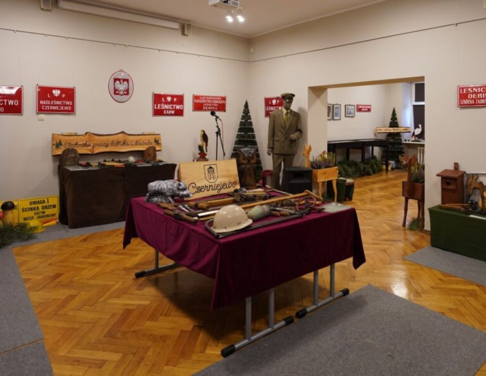Wystawa powstała we współpracy z Czerniejewskim Stowarzyszeniem Kulturalnym „Pokolenia” i pod patronatem Ministerstwa Klimatu i Środowiska. Zaprezentowane w muzeum przedmioty, to bardzo ciekawe wyposażenie drwali i leśników, wykorzystywane w gospodarce leśnej na przestrzeni wielu lat. Znajdziemy tu m.in. ręczne piły, kaski, czy np. średnicomierze, które miały za zadanie pomóc leśnikowi w określeniu wymiarów drewna. W pracy w lesie używano także numeratory, niezbędne do nanoszenie liczb na kolejne sztuki drewna lub do opisywania jego jakości. W pracy w lesie używano też kosturów, tasaków, łopat i wielu mniejszych narzędzi. Wystawę uzupełniły też dawne sprzęty administracyjne, mundury, czy tablice używane do znakowania lasów i obiektów leśnych.
