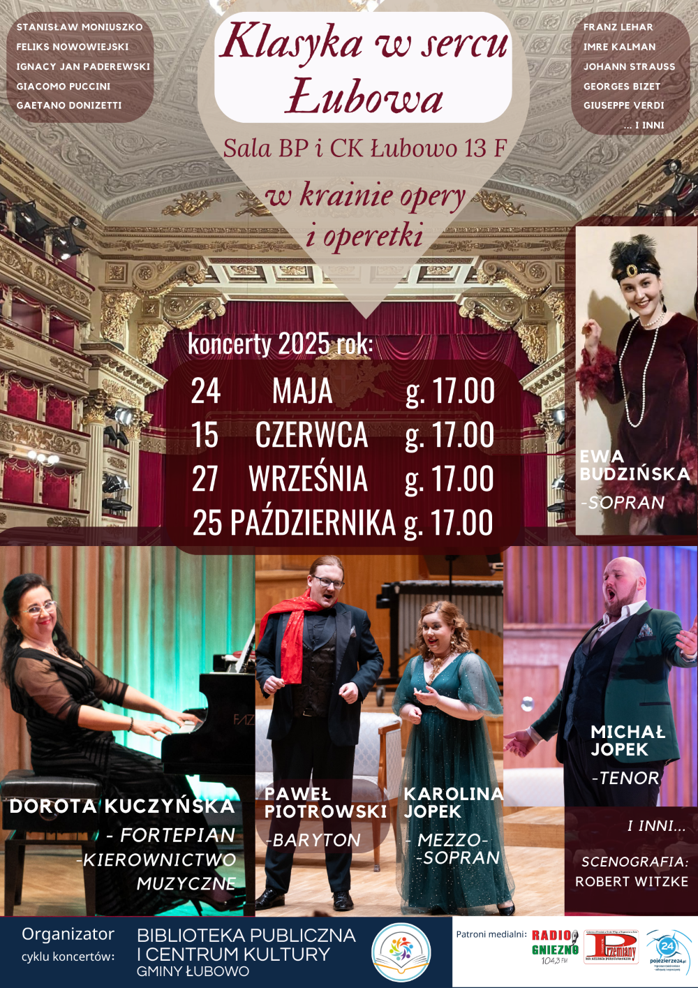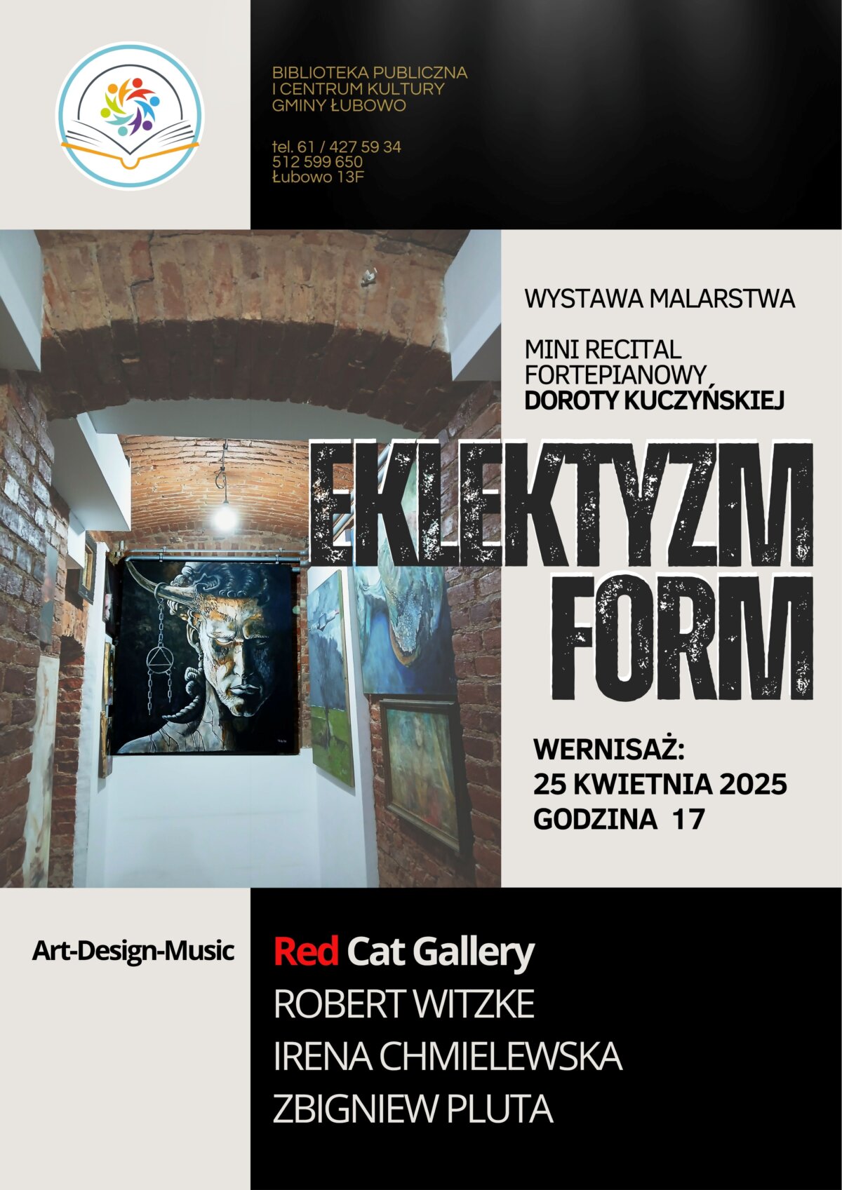 Najbliższe wydarzenie w Bibliotece Publicznej i Centrum Kultury Gminy Łubowo to wystawa malarstwa Roberta Witzke, Ireny Chmielewskiej i Zbigniewa Pluty „EKLEKTYZM FORM” wraz z minirecitalem fortepianowym Doroty Kuczyńskiej. – Na ten wernisaż zapraszamy już 25 kwietnia o godzinie 17. Dedykujemy tę wystawę wszystkim, dla których malarstwo jest ważną formą przekazu, ale nie tylko. Dlaczego łączymy malarstwo i muzykę? Jest to bardo istotna forma dla nas, ponieważ od tej wystawy zaczyna się pewien cykl spektakli muzycznych, operetkowych pod nazwa „Klasyka w sercu Łubowa”, które zorganizowane zostaną w maju, czerwcu, wrześniu i październiku – mówi Iwona Wiśniewska, dyrektor Biblioteki Publicznej i Centrum Kultury Gminy Łubowo. Skąd nazwa „Eklektyzm Form”? – Znamy twórców i chcemy połączyć różne rodzaje sztuk w jednym. Robert Witzke ma bardzo kolorowe, fantastyczne malarstwo, Zbigniew Pluta to przede wszystkim tematy historyczne, natomiast Irena Chmielewska jest trochę dla nas zagadką i jesteśmy bardzo ciekawi jej malarstwa. Tych troje artystów występuje pod jedną nazwą Red Cat Gallery i będzie to ich pierwszy wspólny wernisaż – dodaje Iwona Wiśniewska. Wernisażowi będzie towarzyszył minirecital fortepianowy Doroty Kuczyńskiej. – Będą to utwory skomponowane przez światowej sławy kompozytorów, powstałe między innymi na potrzeby filmowe. Następnie współpraca Doroty Kuczyńskiej i Roberta Witzke będzie się przejawiała w cyklu koncertów zaplanowanych w gminie Łubowo. Pierwszy koncert odbędzie się 24 maja, a będzie to muzyka lat 20. i 30. ubiegłego wieku. Utwory nie tylko polskie, ale pochodzące z Wiednia, ówczesnej stolicy operetki oraz włoskie. Wszystko w scenografii Roberta Witzke – powiedział Rafał Kaczmarek. Następne koncerty to 15 czerwca – „Muzyczna podróż przez świat”, wrzesień to gala operowa i październik – spektakl muzyczny „Wieczór z księżniczką”