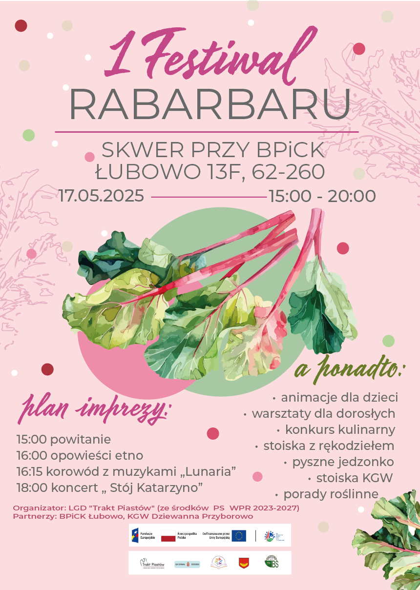 Po doznaniach artystycznych organizatorzy zapraszają do Łubowa na I Festiwal Rabarbaru. – Dlaczego rabarbar? Mamy aktywnych członków (Lokalnej Grupy Działania „Trakt Piastów” – dop. red.), którzy wracają do tradycji, którzy patrzą co jest ważne i istotne i to od nich wyszła propozycja, żeby zrobić festiwal w dobrym, starym stylu. Z poszanowaniem natury, z poszanowaniem tradycji, muzyki ludowej – mówiła Małgorzata Blok, dyrektor LGD „Trakt Piastów”. I Festiwal Rabarbaru zaplanowano 17 maja o godzinie 15, na placu przy bibliotece w Łubowie. W programie m.in. korowód etnobotaniczny, dwa koncerty grup folkowych – zespół „Lunaria” i później „Stój Katarzyno”. Poza tym zajęcia rodzinne, w tym dla najmłodszych warsztaty sensoryczne „Raj Barbar”, a dla starszych gry, konkurs kulinarny, gotowanie wspólne rabarbarowego dżemu oraz tworzenie wiersza z motywem rabarbaru, stoiska lokalnych twórców i wiele innych.