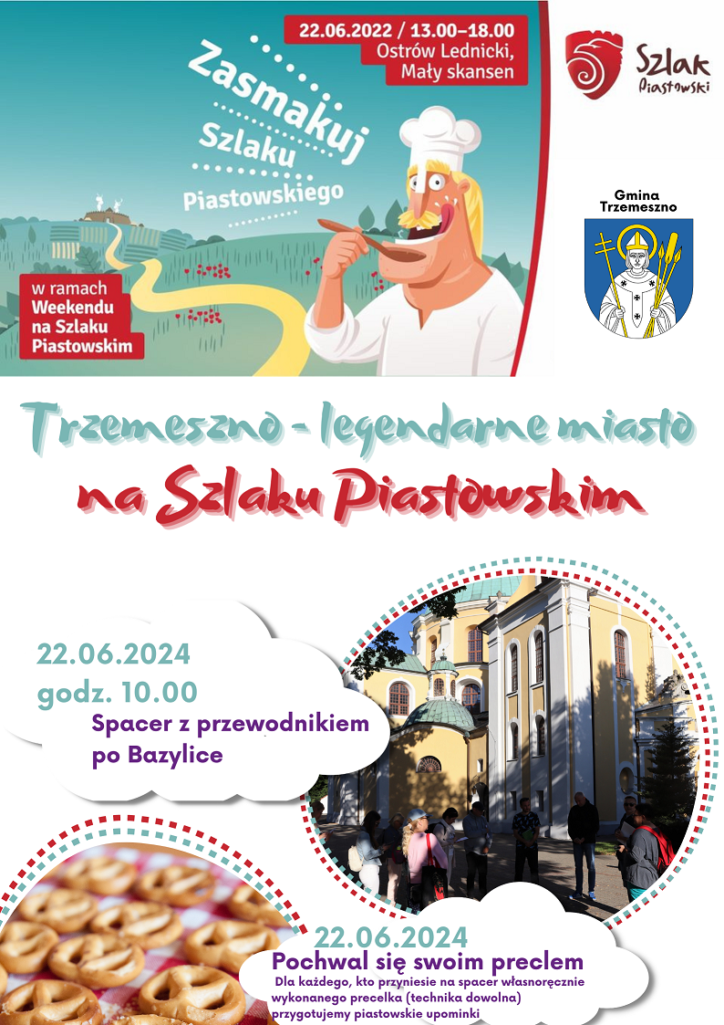 Podczas spaceru z przewodnikiem, który rozpocznie się o godz. 10 będzie można usłyszeć legendy o najdawniejszych dziejach Trzemeszna, zwiedzić wystawę archeologiczną oraz zajrzeć do podziemi świątyni. Ale to nie wszystko! Tegorocznej VII edycji „Weekendu na Szlaku Piastowskim” przewodzi piastowska strawa. Dlatego dla wszystkich, którzy pojawią się na spacerze z własnoręcznie wykonanym preclem (technika dowolna), przygotowano piastowskie upominki.