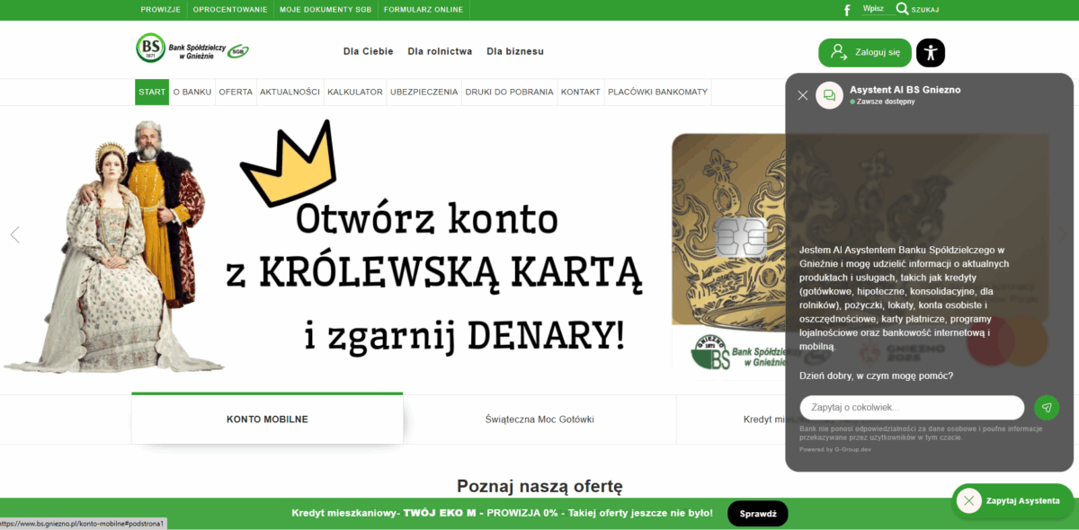 Podążając za postępem technologicznym oraz rosnącymi wymaganiami rynkowymi, Bank Spółdzielczy w Gnieźnie jako jeden z pierwszych w Polsce banków spółdzielczych uruchomił na swojej stronie www.bs.gniezno.pl asystenta AI, czyli chatbota.
