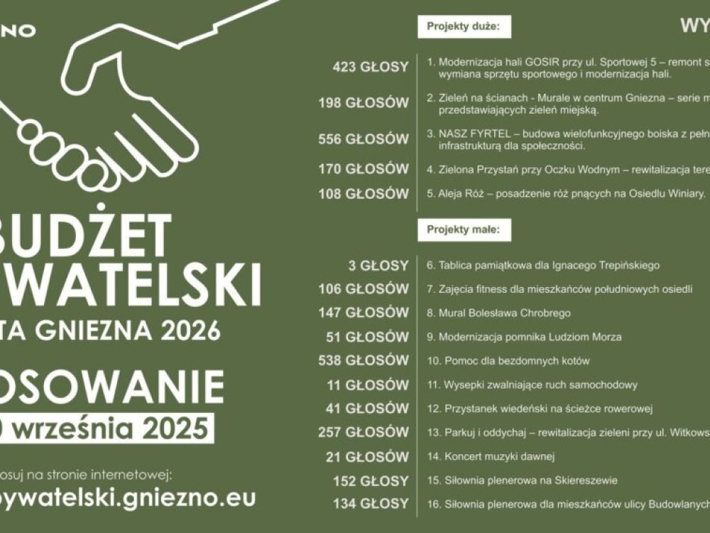 Urząd Miejski w Gnieźnie opublikował listę projektów raz z oddanymi na nie głosami na dzień 23 września. Do końca głosowania w Budżecie Obywatelskim Miasta Gniezna zostało kilka dni. Tutaj wszystko może się jeszcze zmienić!
