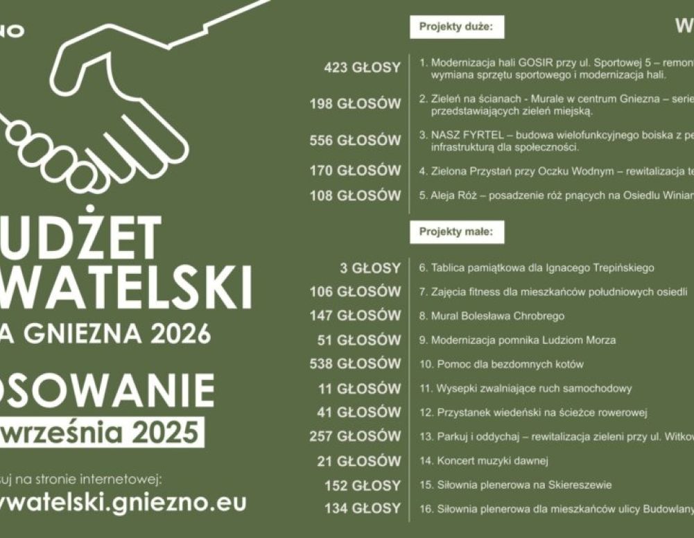 Urząd Miejski w Gnieźnie opublikował listę projektów raz z oddanymi na nie głosami na dzień 23 września. Do końca głosowania w Budżecie Obywatelskim Miasta Gniezna zostało kilka dni. Tutaj wszystko może się jeszcze zmienić!