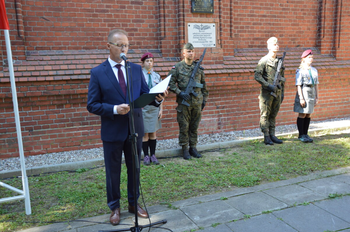 W tym roku był to teren przy szpitalu Dziekanka. O historii tego miejsca powiedziano już bardzo wiele i chyba każdy gnieźnianin – ale nie tylko – wie, jak dramatyczne wydarzenia właśnie tutaj się rozgrywały. O czym przypomniał też Michał Powałowski, prezydent Gniezna przemawiając do przybyłych na tegoroczne uroczystości. – Dramatyczne wydarzenia rozpoczęły się tuż po rozpoczęciu II wojny światowej. Już jesienią 1939 roku. Po wkroczeniu wojsk niemieckich do Gniezna, dyrektor Dziekanki Wiktor Ratka, Polak, natychmiast zakłada niemiecki mundur, zaczyna mówić tylko po niemiecku. Rozpoczyna zwolnienia Polaków pracujących w szpitalu – mówił prezydent Gniezna, dodając że to był dopiero początek tego zła, które nadeszło chwilę później: akcji T4. – Akcja pod kryptonimem T4, akcja eliminacji osób fizycznie i umysłowo upośledzonych, była planowana już przed wojną przez Hitlera. Zdaniem tego największego zbrodniarza w historii, chorzy zajmowali łóżka, które mogły być potrzebne dla rannych żołnierzy i narażali kraj na niepotrzebne wydatki. Organizacja T4, działająca w szpitalu, kwalifikowała pacjentów, którzy mieli zostać zamordowani. Pierwsze ofiary to grupa 61 Żydów, zamordowanych 7 grudnia 1939 roku. Pacjenci byli odurzani, trafiali do dużego auta, kontenera, do którego wtłaczane były gazy spalinowe. W chwili, gdy kierowca ruszał, włączany był gaz, który po drodze zabijał wszystkich. Zaczadzeni pacjenci byli wywożeni kilkadziesiąt kilometrów od Gniezna i chowani we wspólnych mogiłach. Mogiłach, których nie odnaleziono do dzisiaj. Według oficjalnych danych, w ten sposób zamordowano 3586 pacjentów. (…) Dziś wspominamy tych niewinnych, chorych, kobiety, dzieci, różnych narodowości, którzy stracili życie w imię chorej, zbrodniczej wizji Adolfa Hitlera i jego zwolenników. Dziś oddajemy im hołd, pochylamy głowę, myślimy o nich – mówił prezydent Michał Powałowski, podkreślając że akcja T4 oficjalnie została przerwana, z osobistego polecenia Adolfa Hitlera, 24 sierpnia 1941 roku, ale tak naprawdę zbrodnicze działania w tym miejscu trwały do końca wojny. Szpital Dziekanka, w czasie wojny nazywany Tiegenhof, został wyzwolony 20 stycznia 1945 roku. – Eksterminacja psychicznie i nieuleczalnie chorych, określona kryptonimem „T4”, stanowiła preludium Holocaustu, największej zbrodni w historii ludzkości – podkreślił prezydent Gniezna.