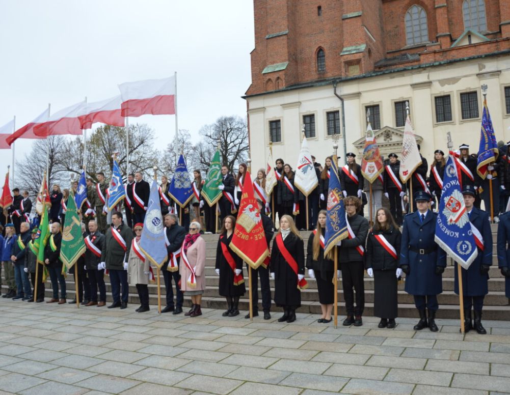 Miejskie obchody rozpoczęły się już dzień wcześniej, bo 10 listopada w Miejskim Ośrodku Kultury, koncertem „Meninas Duo – Czary”, organizowanym w ramach IV Paderewski Festival. Obchody były kontynowanie 11 listopada. Rozpoczęły się w gnieźnieńskiej katedrze mszą świętą w intencji Ojczyzny, sprawowaną przez ks. abpa Wojciecha Polaka, Prymasa Polski. Po nabożeństwie zgromadzeni przeszli na plac im. Mikołaja Trąby, gdzie odbywała się dalsza część uroczystości. Najpierw zaprezentowano uczestników konkursu „Zostań Herosem Niepodległości”, wykonane zostało pamiątkowe zdjęcie „Pod Biało – Czerwoną” – dwudziestometrową flagą Polski, a chwilę później odśpiewany został Mazurek Dąbrowskiego. O godzinie 11:11 sprzed katedry wyruszył XI Bieg Niepodległości. Gdy bieg wystartował, na placu przy katedrze kontynuowano uroczystość. Do zebranych zwróciła się Joanna Śmigielska, wiceprezydent Gniezna. – Spotkamy się dziś, 11 listopada, w dniu szczególnym dla każdego Polaka. To dzień, w którym z dumą i wdzięcznością wspominamy tych, którzy wywalczyli dla nas wolność. To dzień, w którym uświadamiamy sobie, że niepodległość nie jest nam dana raz na zawsze, lecz jest wartością, którą trzeba pielęgnować, umacniać i przekazywać kolejnym pokoleniom. Stojąc dziś przy pomniku Bolesława Chrobrego, pierwszego króla Polski, w miejscu tak głęboko związanym z naszą historią, czujemy że Gniezno jest nie tylko kolebką polskiej państwowości, ale również miejscem, gdzie duch wolności i niezależności narodu ma swoje korzenie – mówiła wiceprezydent Gniezna. – Ten rok był dla naszego miasta szczególny. Obchodziliśmy 1000. – lecie koronacji Bolesława Chrobrego, wydarzenia które na zawsze wpisało Gniezno w dzieje Polski i Europy. Przez cały rok wspólnie przypominaliśmy sobie, że to właśnie tutaj, w Gnieźnie, zaczęła się historia polskiego królestwa. To tutaj, przed tysiącem lat, zrodziła się idea państwa opartego na wspólnych wartościach, kulturze i wierze. Dzisiejsze święto, Narodowe Święto Niepodległości, przypomina nam, że ta idea przetrwała przez wieki, że mimo rozbiorów, okupacji, wojen i trudnych momentów w historii, Polacy nigdy nie przestali wierzyć w wolność. Tak jak Bolesław Chrobry budował potęgę młodego państwa tysiąc lat, tak nasi przodkowie z przełomu XIX i XX wieku odbudowywali Polskę w swoich sercach, zanim mogli ją odbudować na mapie. Dziś oddajemy hołd tym wszystkim, którzy w 1918 roku przyczynili się do odzyskania niepodległości – podkreślała Joanna Śmigielska, apelując do zgromadzonych o jedność, „bo tylko razem, pamiętając o przeszłości, ale i patrząc w przyszłość, możemy budować silne i sprawiedliwe państwo”. Wiceprezydent Gniezna podziękowała też wszystkim za obecność i wspólne przeżywanie Narodowego Święta Niepodległości.