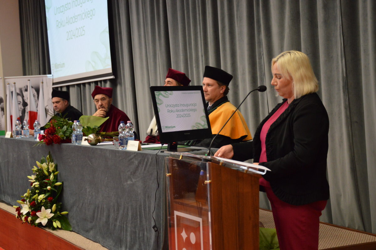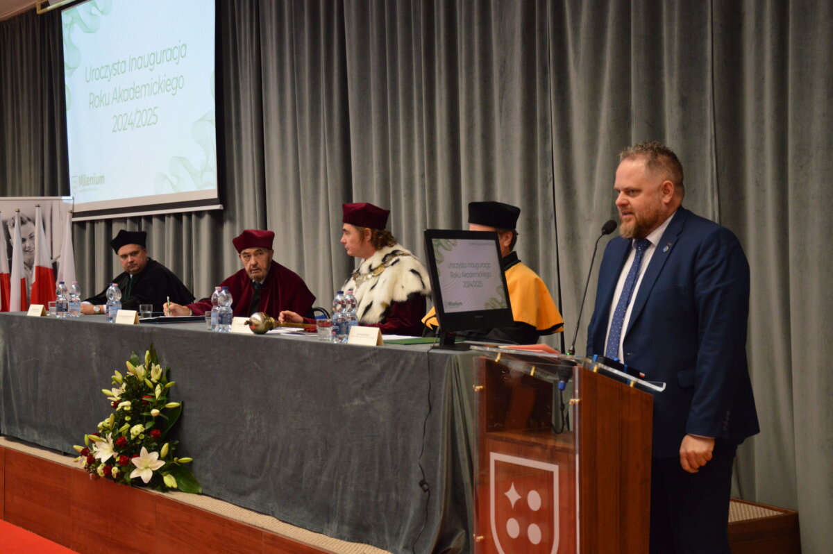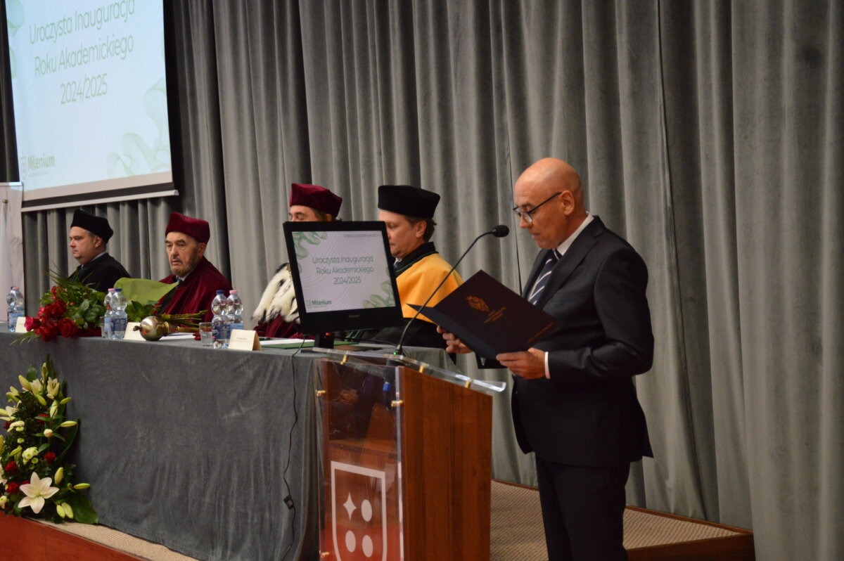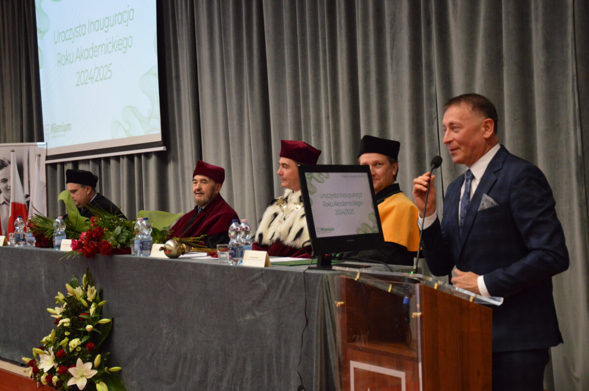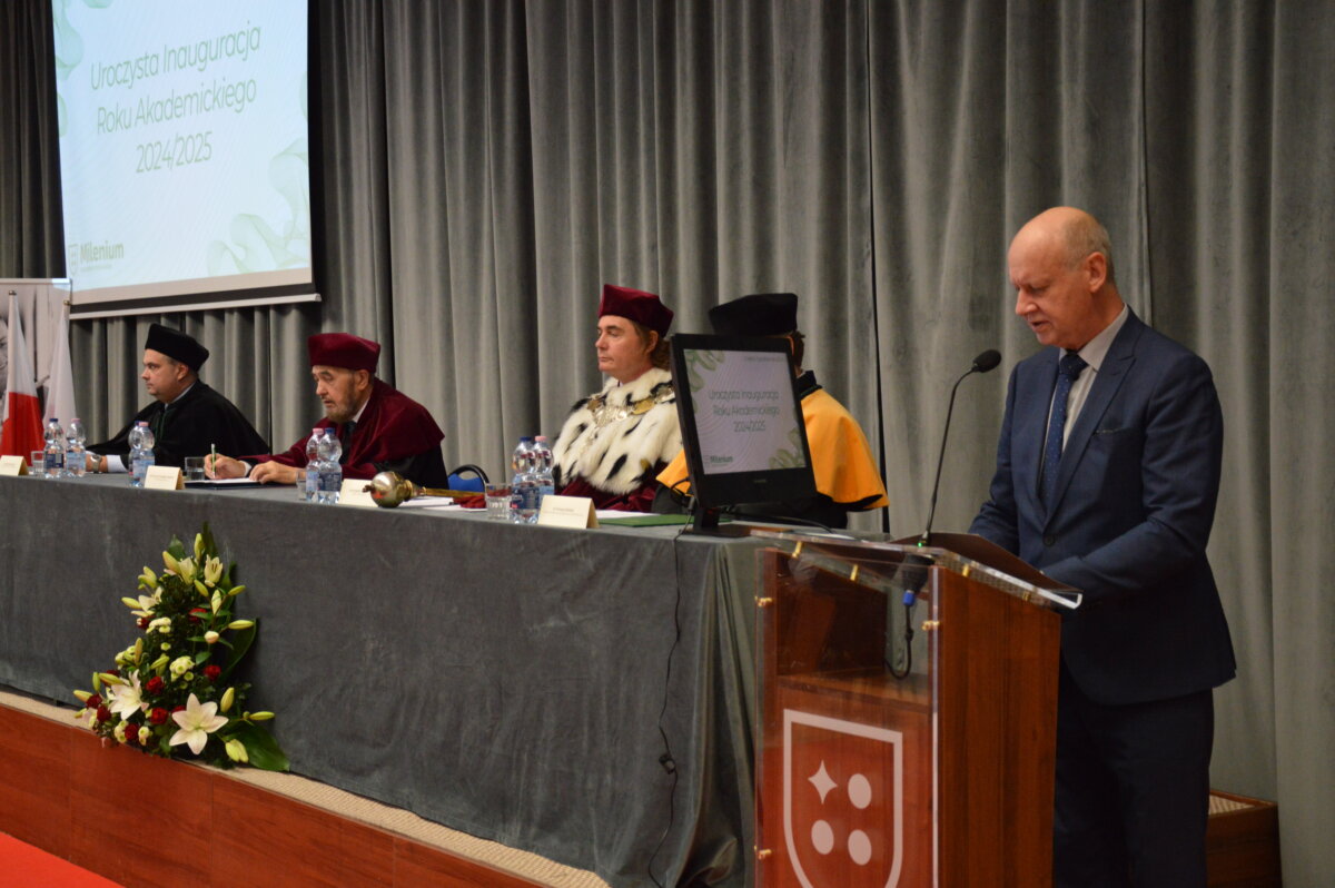 Po oficjalnym rozpoczęciu roku akademickiego 2024/2025 dr Tomasz Albiński, dziekan Wydziału Nauk Społecznych w GSW Milenium przyjął ślubowanie studentów pierwszego roku I stopnia kierunków: pedagogika przedszkolna i wczesnoszkolna, pedagogika i zarządzanie oraz pierwszego roku II stopnia kierunku: zarządzanie, po czym przedstawicielom poszczególnych kierunków wręczone zostały e – indeksy. Następnie głos mogli zabrać zaproszeni goście, towarzyszący tego dnia społeczności akademickiej GSW Milenium. Zwieńczeniem spotkania stała się część poświęcona na inauguracyjny wykład.