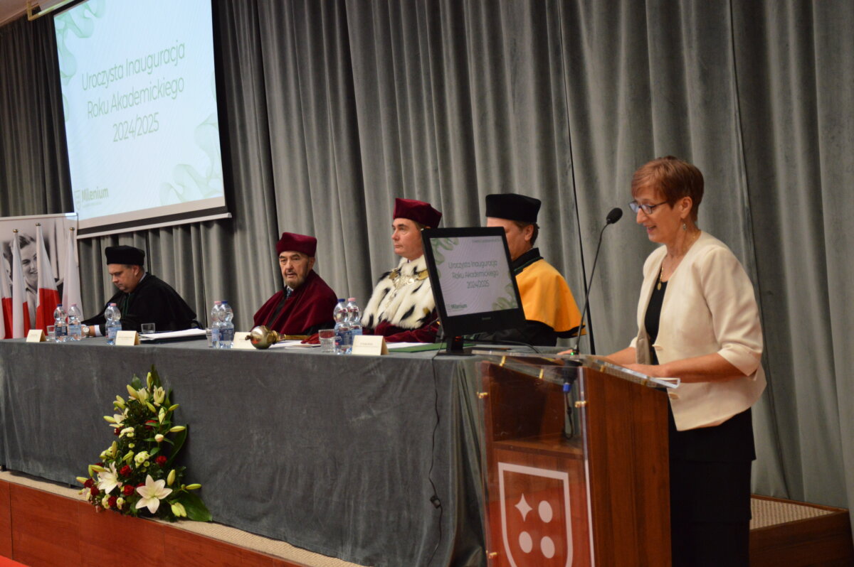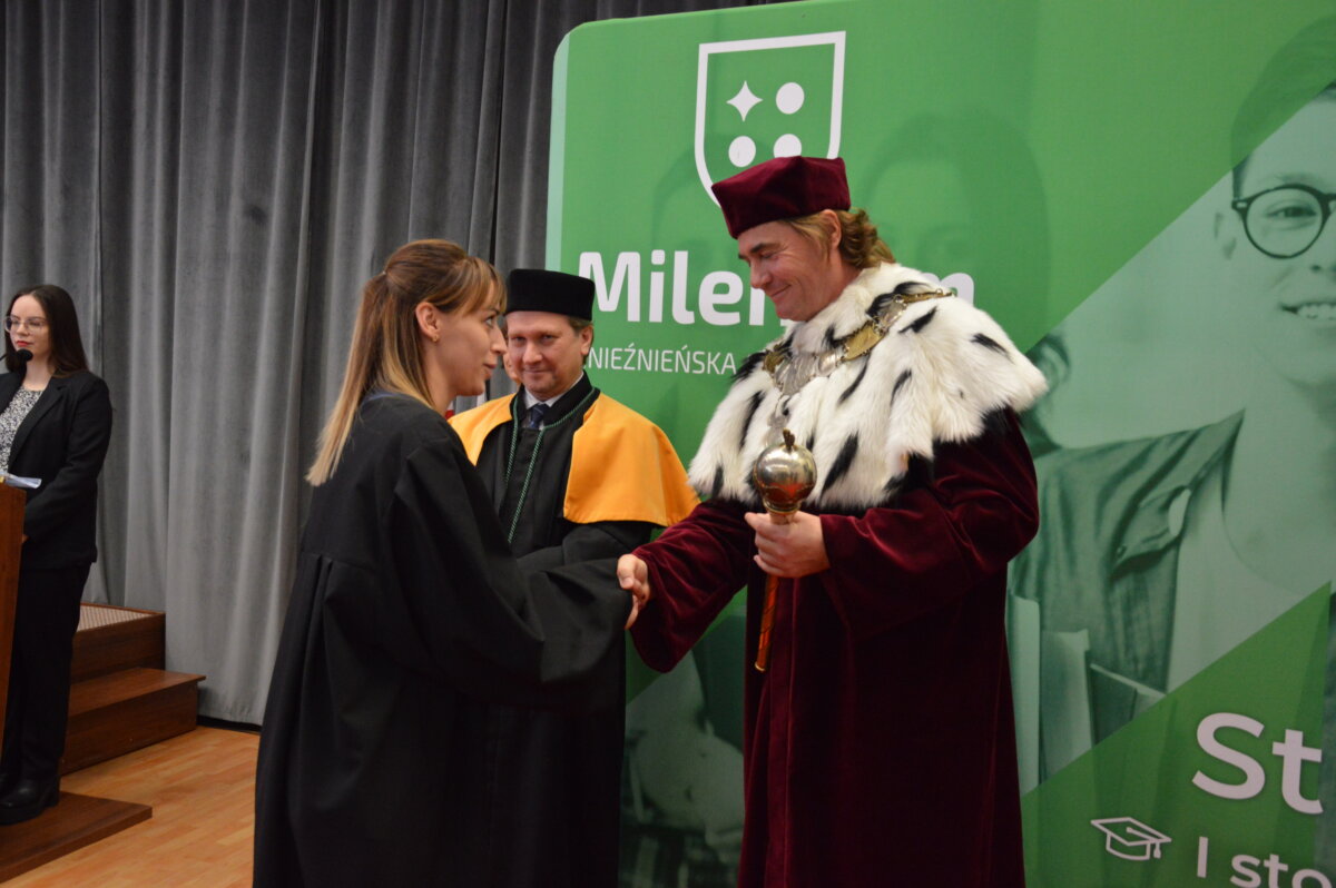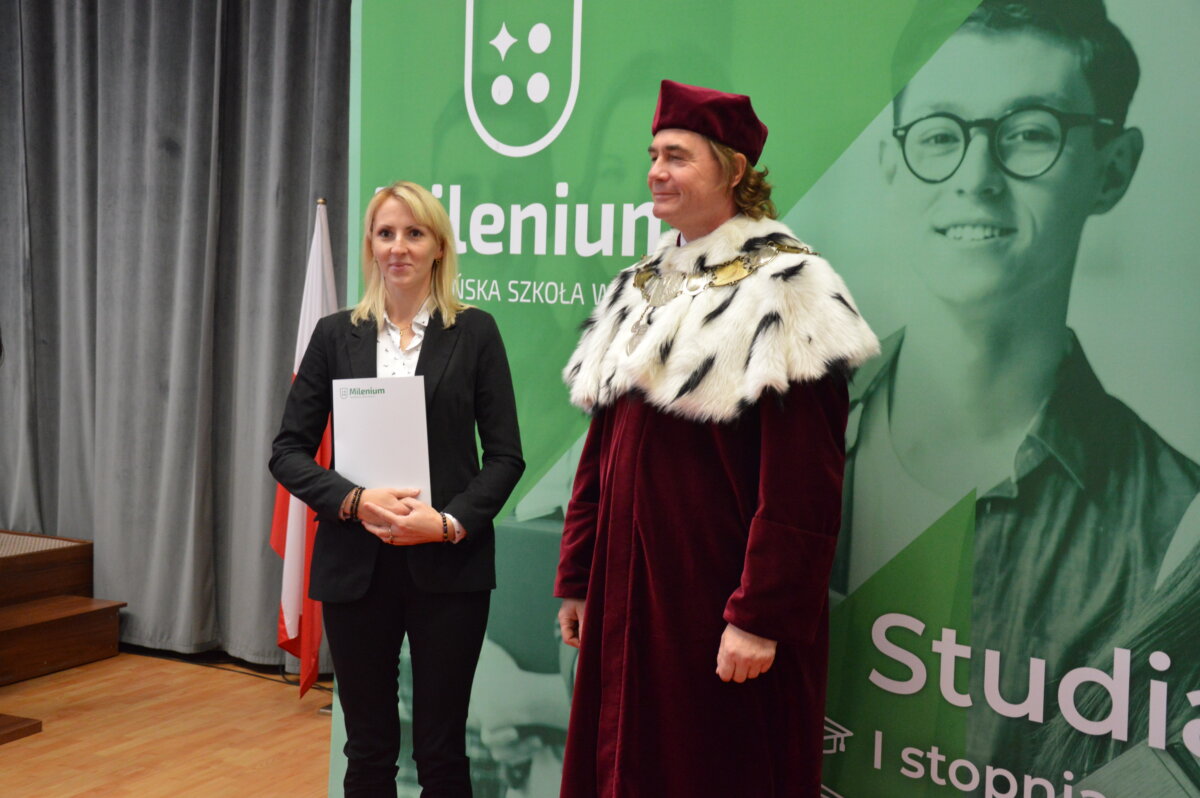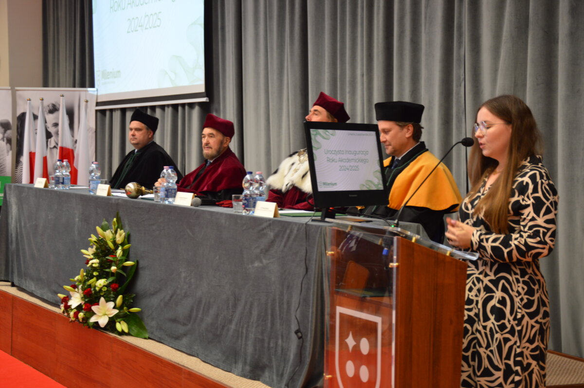 Po oficjalnym rozpoczęciu roku akademickiego 2024/2025 dr Tomasz Albiński, dziekan Wydziału Nauk Społecznych w GSW Milenium przyjął ślubowanie studentów pierwszego roku I stopnia kierunków: pedagogika przedszkolna i wczesnoszkolna, pedagogika i zarządzanie oraz pierwszego roku II stopnia kierunku: zarządzanie, po czym przedstawicielom poszczególnych kierunków wręczone zostały e – indeksy. Następnie głos mogli zabrać zaproszeni goście, towarzyszący tego dnia społeczności akademickiej GSW Milenium. Zwieńczeniem spotkania stała się część poświęcona na inauguracyjny wykład.