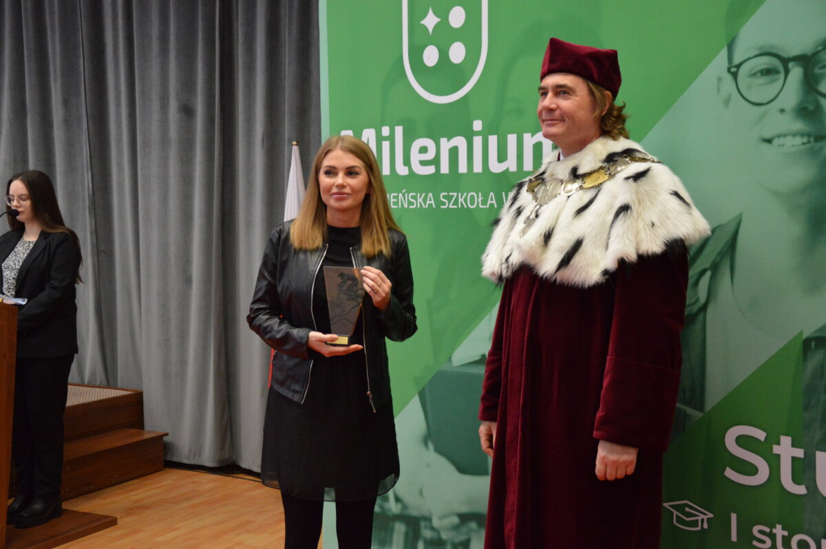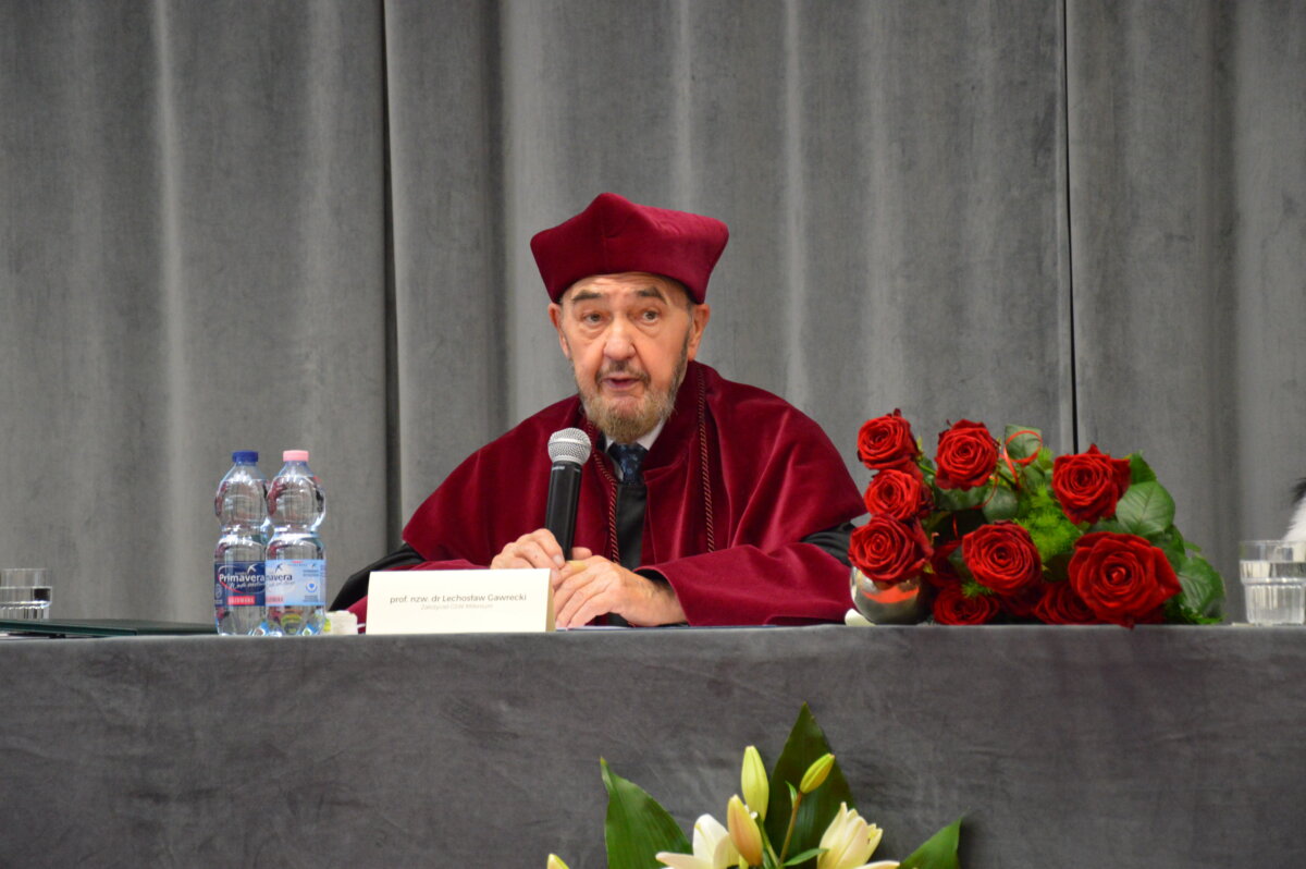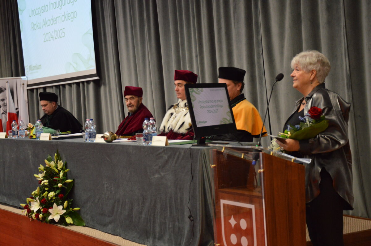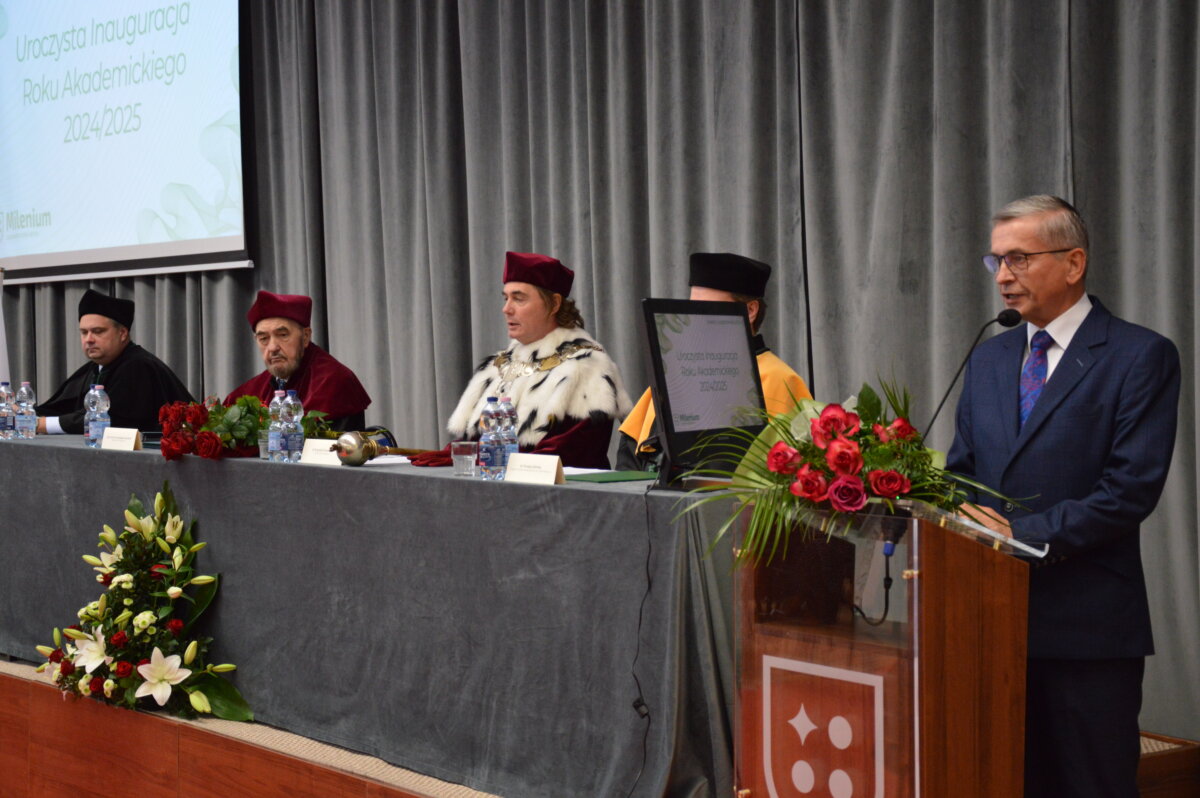 Zanim dokonano oficjalnego rozpoczęcia roku akademickiego 2024/2025 w GSW Milenium, odbyła się uroczystość jubileuszowa, związana z 60 – leciem pracy akademickiej – pedagogicznej, dydaktycznej i naukowej – prof. nzw. dra Lechosława Gawreckiego, założyciela uczelni. Na prośbę samego jubilata, ta część spotkania przybrała skromny charakter, polegający na przedstawieniu sylwetki założyciela GSW Milenium i jego imponującego stażu pracy, złożeniu gratulacji i życzeń ze strony społeczności akademickiej oraz przybyłych gości, a także krótkim przemówieniu profesora. – Dla mnie zawsze najważniejsze było kształtowanie osobowości człowieka. On, oczywiście, powinien mieć wiedzę w głowie, ale nie ta wiedza jest najważniejsza. Nie po to się uczy, żeby mieć wszystko w głowie – tutaj udało się wyprzedzić epokę – bo przecież wówczas wszystko było w encyklopedii, czy w podręczniku, a dzisiaj jest w komputerze, w komórce i nie ma potrzeby uczyć się na pamięć. Rozumieć, interpretować, znaleźć – to jest to, czego trzeba się uczyć – mówił prof. nzw. dr Lechosław Gawrecki. – Doszedłem do tego, pracuję dla przyjemności (…). Ta praca,kontakt ze szkołą i ze studentami to jest to, co daje mi przyjemność i dla tej przyjemności uczę – podkreślał założyciel uczelni.