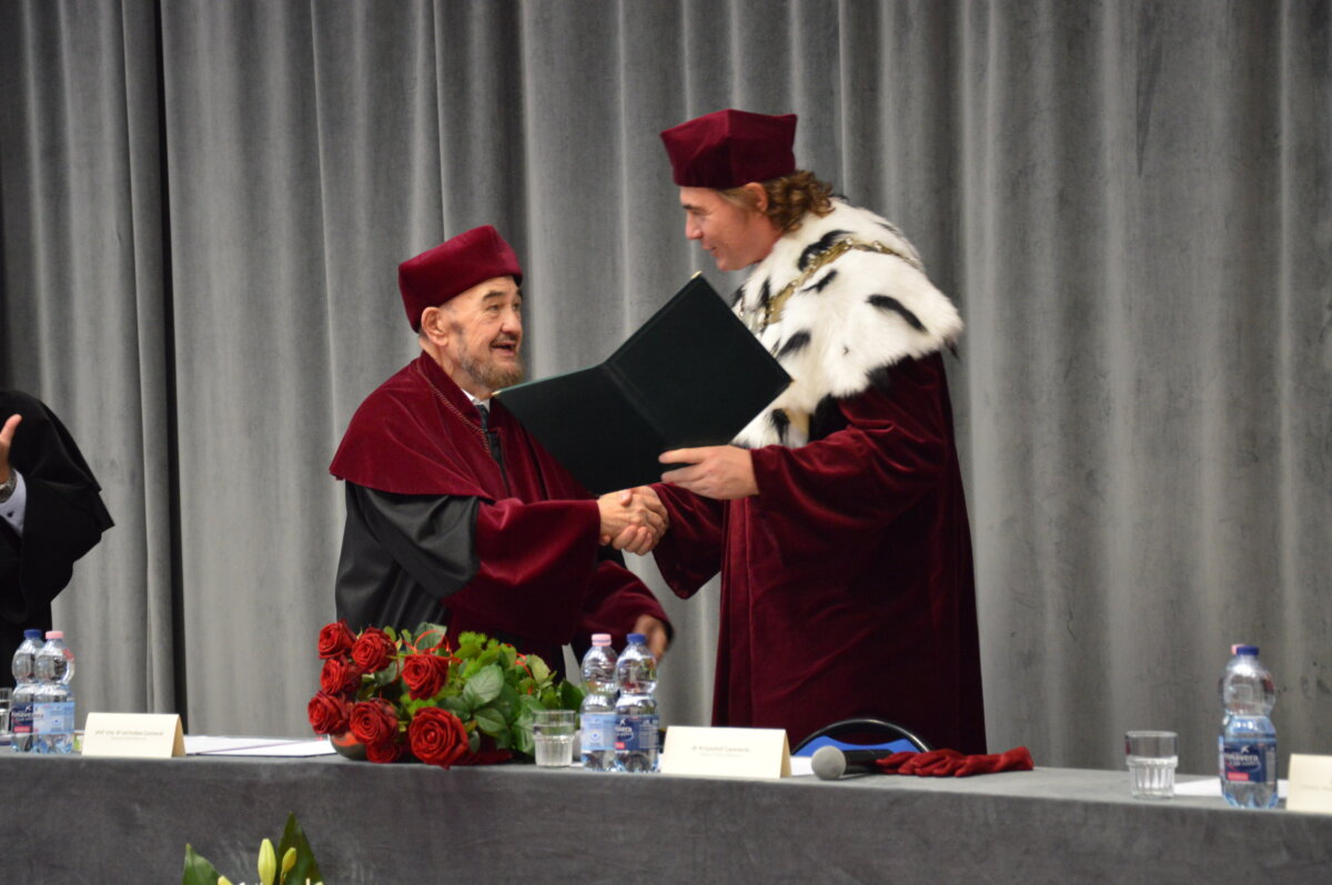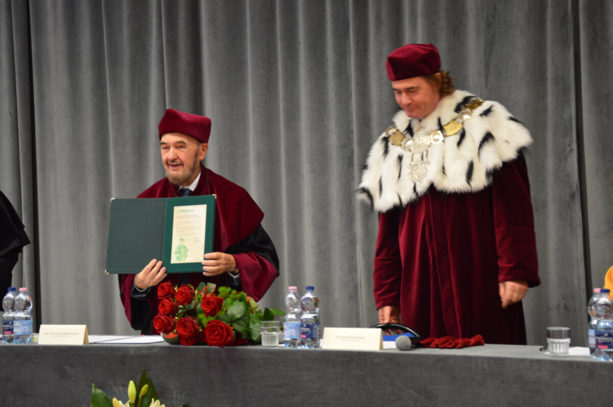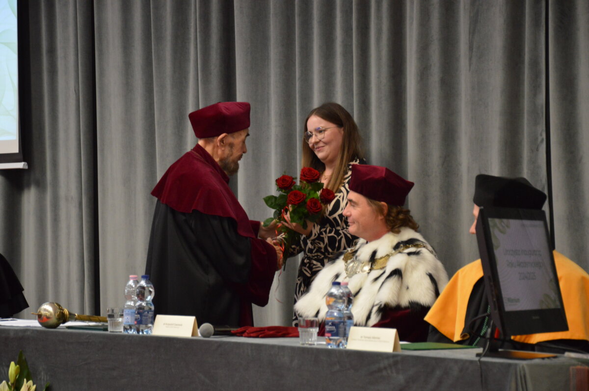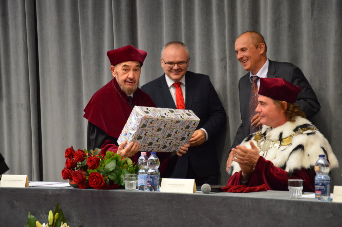 Zanim dokonano oficjalnego rozpoczęcia roku akademickiego 2024/2025 w GSW Milenium, odbyła się uroczystość jubileuszowa, związana z 60 – leciem pracy akademickiej – pedagogicznej, dydaktycznej i naukowej – prof. nzw. dra Lechosława Gawreckiego, założyciela uczelni. Na prośbę samego jubilata, ta część spotkania przybrała skromny charakter, polegający na przedstawieniu sylwetki założyciela GSW Milenium i jego imponującego stażu pracy, złożeniu gratulacji i życzeń ze strony społeczności akademickiej oraz przybyłych gości, a także krótkim przemówieniu profesora. – Dla mnie zawsze najważniejsze było kształtowanie osobowości człowieka. On, oczywiście, powinien mieć wiedzę w głowie, ale nie ta wiedza jest najważniejsza. Nie po to się uczy, żeby mieć wszystko w głowie – tutaj udało się wyprzedzić epokę – bo przecież wówczas wszystko było w encyklopedii, czy w podręczniku, a dzisiaj jest w komputerze, w komórce i nie ma potrzeby uczyć się na pamięć. Rozumieć, interpretować, znaleźć – to jest to, czego trzeba się uczyć – mówił prof. nzw. dr Lechosław Gawrecki. – Doszedłem do tego, pracuję dla przyjemności (…). Ta praca,kontakt ze szkołą i ze studentami to jest to, co daje mi przyjemność i dla tej przyjemności uczę – podkreślał założyciel uczelni.