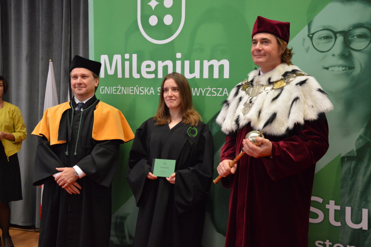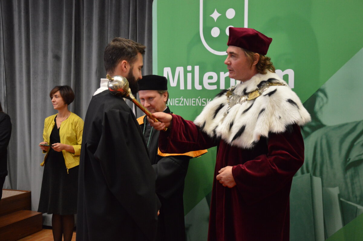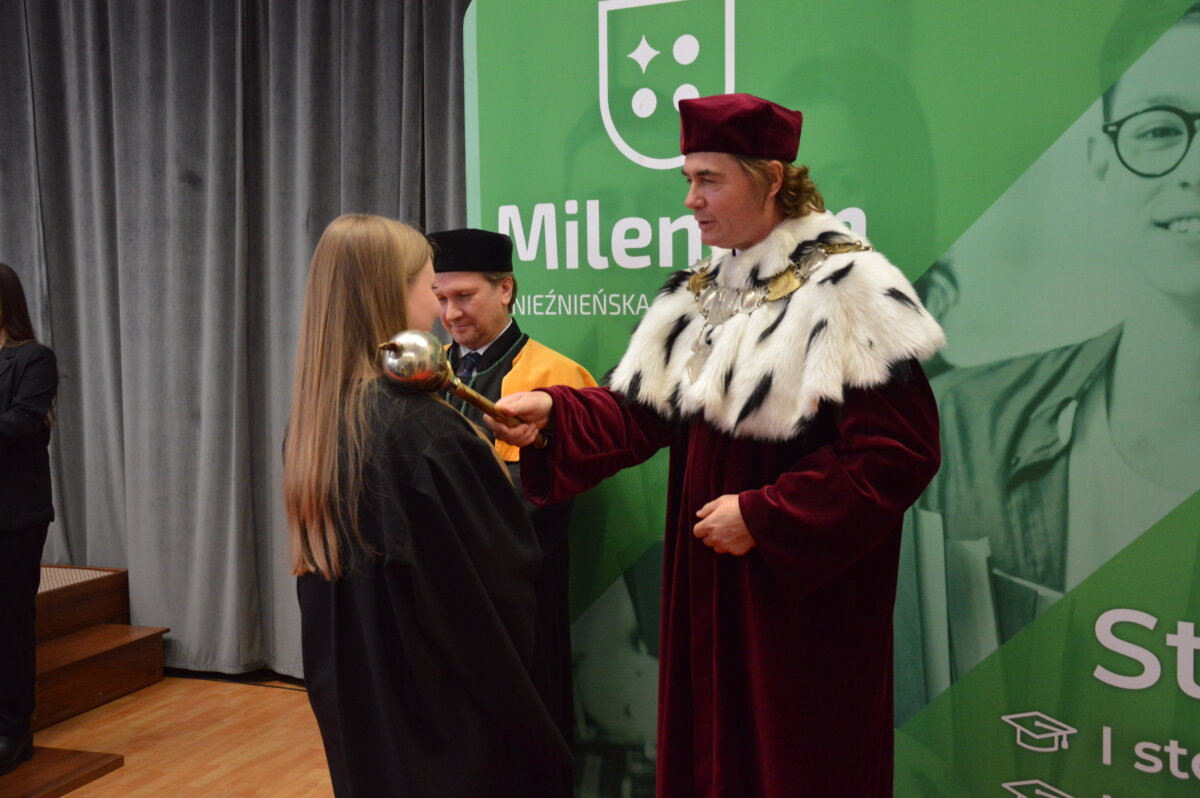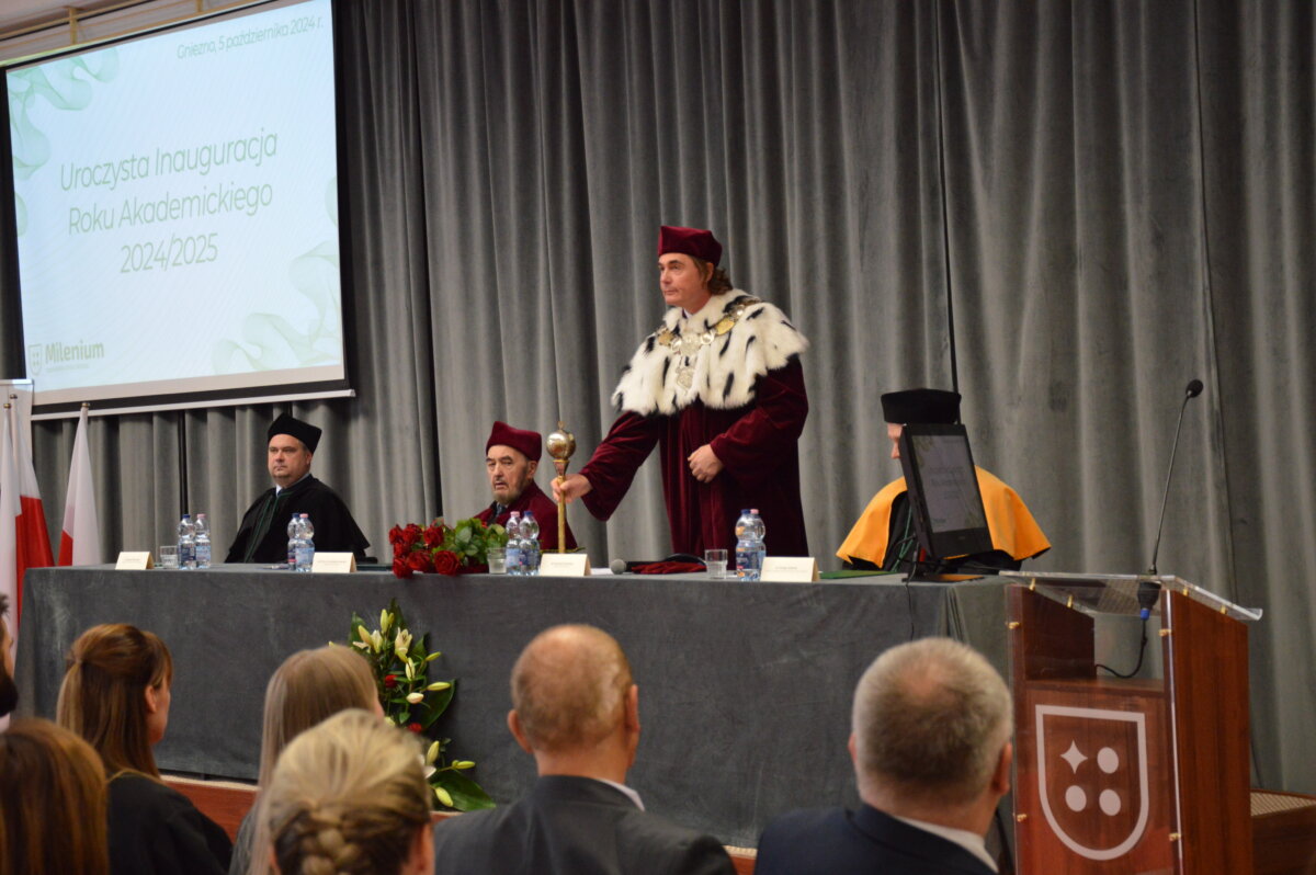 Następnie słowami łacińskiej sentencji „Quod bonum, felix, faustum, fortunatumque sit!” rektor uroczyście rozpoczął kolejny rok akademicki, w sposób szczególny witając w murach uczelni studentów pierwszego roku kierunków zarządzanie, pedagogika, pedagogika przedszkolna i wczesnoszkolna. – Inauguracja roku akademickiego to najważniejszy dzień każdego roku akademickiego, ale to także uroczystość niezwykła i uniwersalna. W tych dniach bowiem spotykamy się w uczelniach w Polsce i na świecie, aby przypomnieć sobie o akademickiej tradycji, o wartościach, które nas łączą, o celach, które uznajemy za ważne. W tym dniu wszyscy doświadczamy wspólnoty. Razem, osoby studiujące i pracujące w uczelni, współpracujące z nią, tworzymy naszą Gnieźnieńską Szkołę Wyższą Milenium. Wspólnotę i instytucję. Budujemy uczelnię otwartą, ale na solidnym fundamencie akademickim, pamiętając o tradycjach. Jesteśmy wspólnotą zaangażowaną i odpowiedzialną. Myślimy nie tylko o współczesności, lecz także o kolejnych pokoleniach. Działamy odważnie, ponieważ podejmujemy wyzwania i chcemy zmieniać otaczającą nas rzeczywistość. Taka jest właśnie Gnieźnieńska Szkoła Wyższa Milenium – mówił dr Krzysztof Gawrecki.