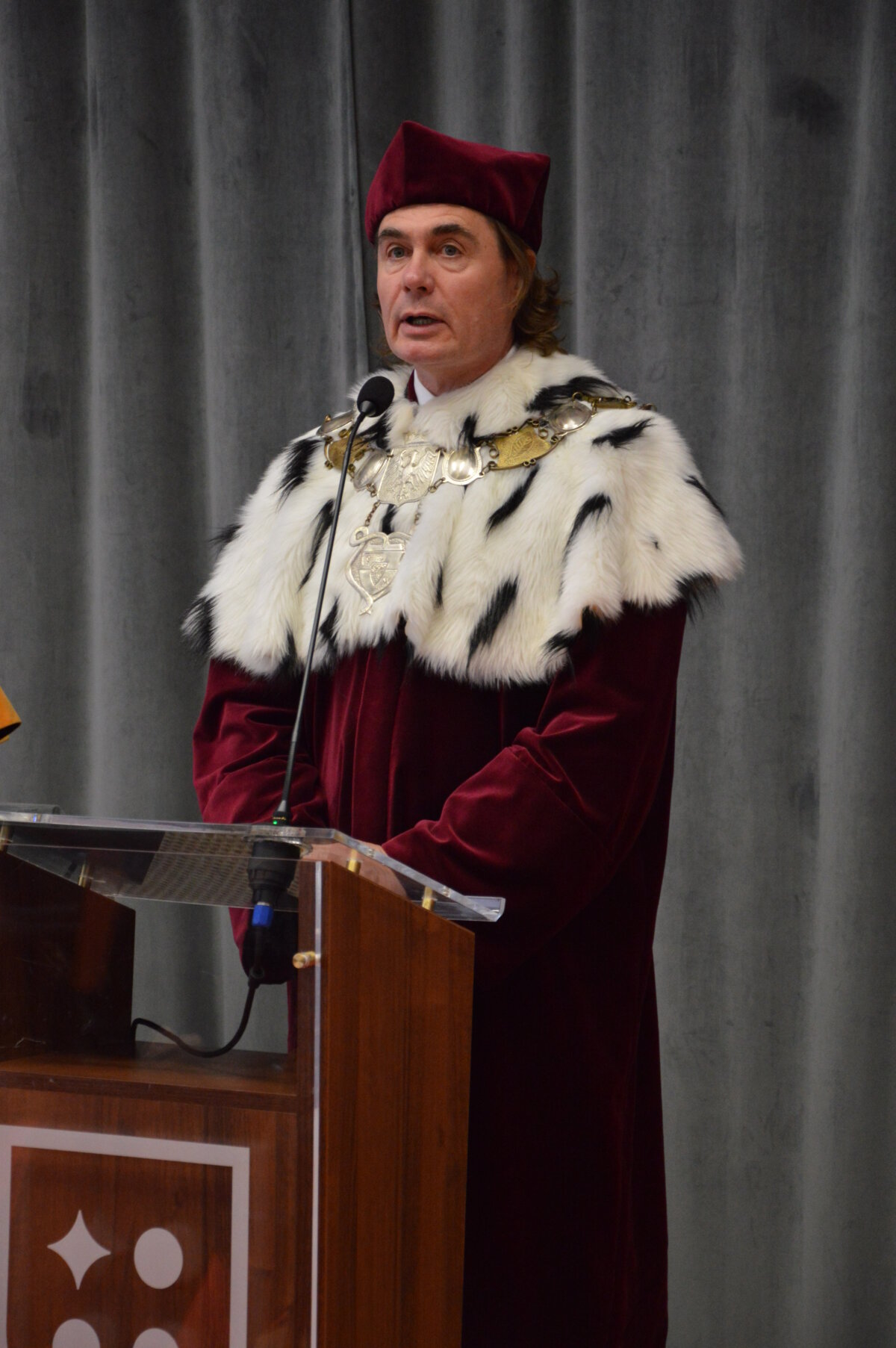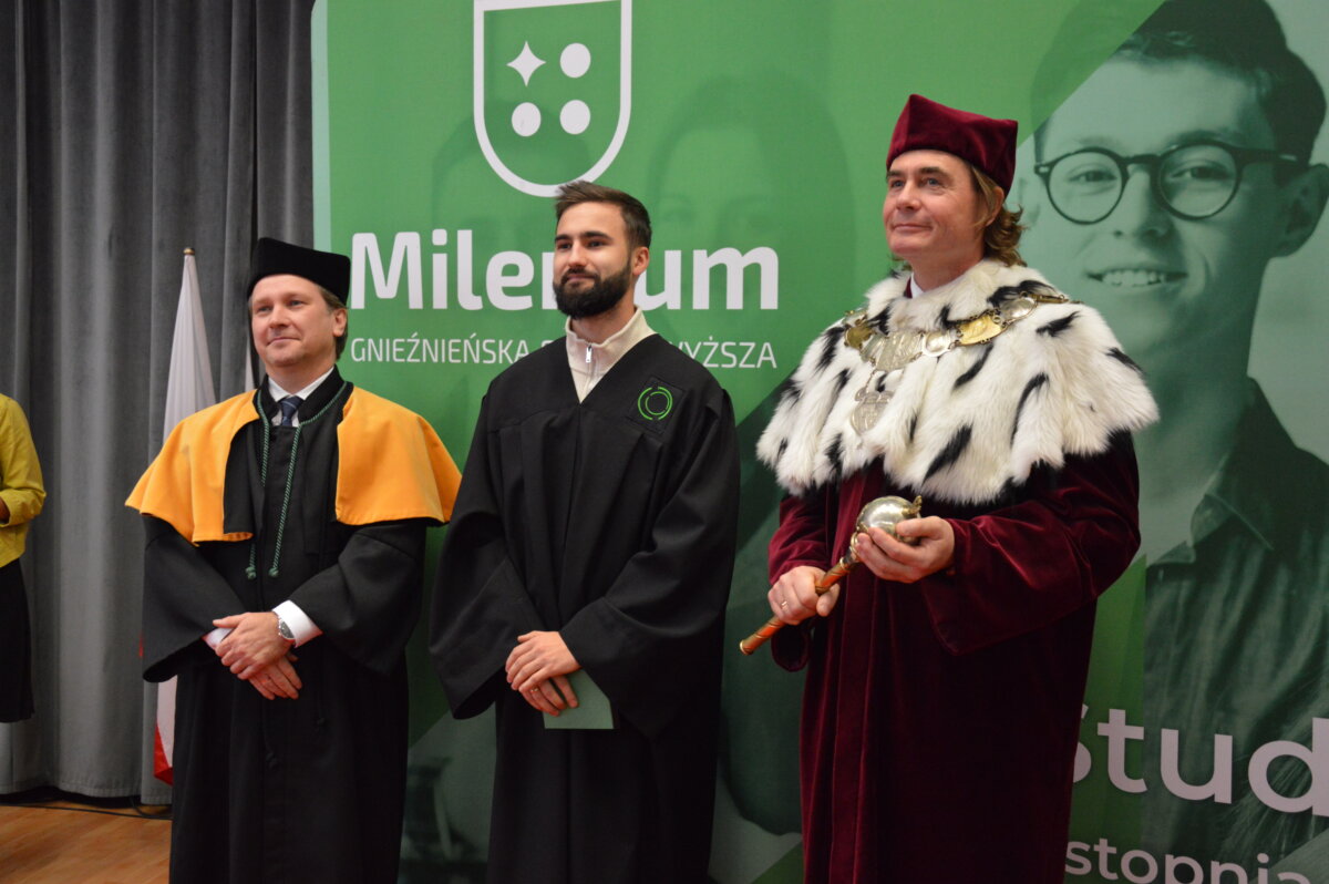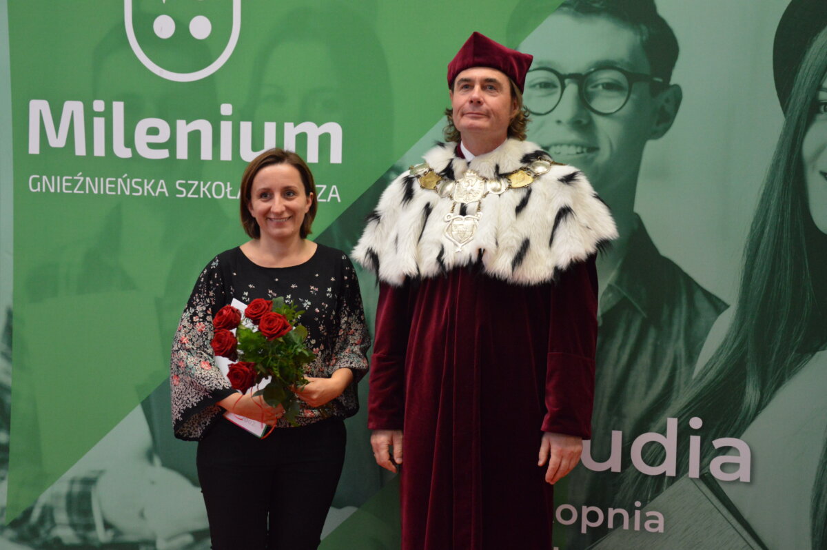 Następnie słowami łacińskiej sentencji „Quod bonum, felix, faustum, fortunatumque sit!” rektor uroczyście rozpoczął kolejny rok akademicki, w sposób szczególny witając w murach uczelni studentów pierwszego roku kierunków zarządzanie, pedagogika, pedagogika przedszkolna i wczesnoszkolna. – Inauguracja roku akademickiego to najważniejszy dzień każdego roku akademickiego, ale to także uroczystość niezwykła i uniwersalna. W tych dniach bowiem spotykamy się w uczelniach w Polsce i na świecie, aby przypomnieć sobie o akademickiej tradycji, o wartościach, które nas łączą, o celach, które uznajemy za ważne. W tym dniu wszyscy doświadczamy wspólnoty. Razem, osoby studiujące i pracujące w uczelni, współpracujące z nią, tworzymy naszą Gnieźnieńską Szkołę Wyższą Milenium. Wspólnotę i instytucję. Budujemy uczelnię otwartą, ale na solidnym fundamencie akademickim, pamiętając o tradycjach. Jesteśmy wspólnotą zaangażowaną i odpowiedzialną. Myślimy nie tylko o współczesności, lecz także o kolejnych pokoleniach. Działamy odważnie, ponieważ podejmujemy wyzwania i chcemy zmieniać otaczającą nas rzeczywistość. Taka jest właśnie Gnieźnieńska Szkoła Wyższa Milenium – mówił dr Krzysztof Gawrecki.