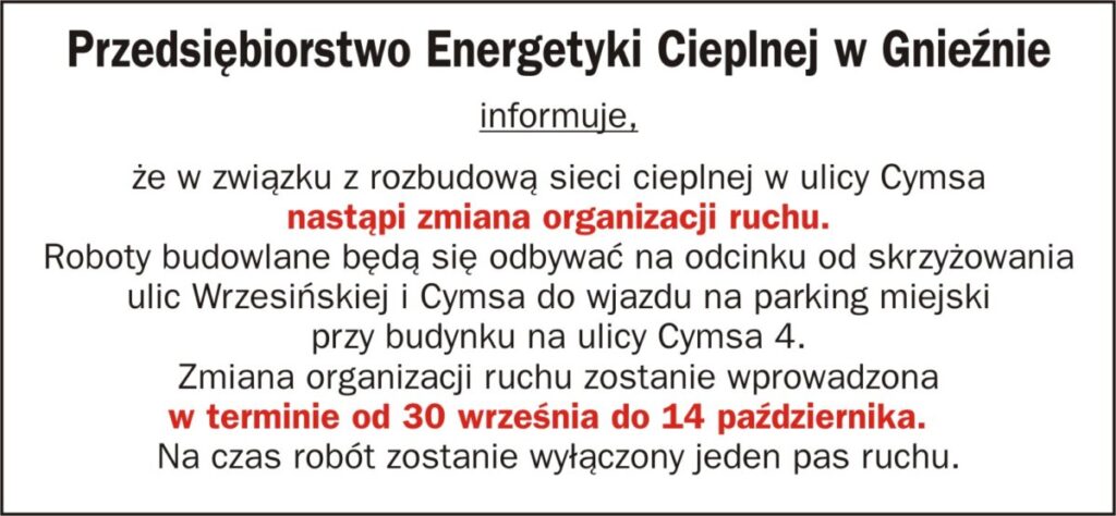 Przedsiębiorstwo Energetyki Cieplnej w Gnieźnie informuje, że w związku z rozbudową sieci cieplnej w ulicy Cymsa nastąpi zmiana organizacji ruchu.