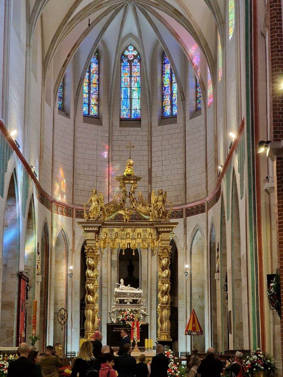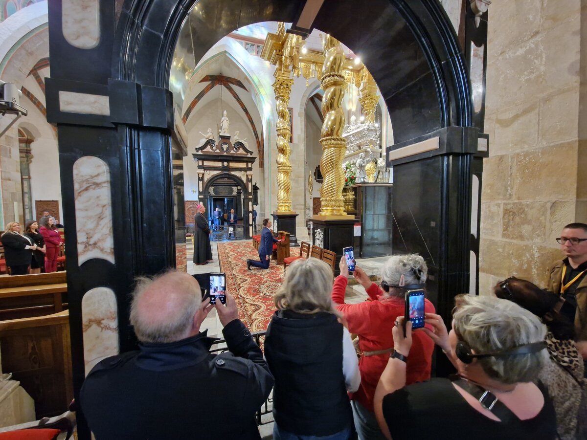 Według harmonogramu zamieszczonego na stronie internetowej Kancelarii Sejmu, marszałek miał złożyć wieniec przed pomnikiem Bolesława Chrobrego o godzinie 14.40. Jednak spotkania z drugą osobą w państwie, które miały miejsce po uroczystym powiedzeniu Sejmu i Senatu opóźniły ten punkt jego wizyty w Gnieźnie o ponad godzinę. W asyście honorowej straży marszałkowskiej Szymon Hołownia złożył kwiaty u stóp Chrobrego po czym został przywitany przez abpa Wojciecha Polaka. Po krótkiej rozmowie prymas zaprosił marszałka do archikatedry, w której pełnił rolę gospodarza i przewodnika. Co warto zaznaczyć, mimo istotnej funkcji, jaką pełni w polskim systemie ustrojowym marszałek Sejmu, ochrona marszałkowska nie robiła problemu w kontaktach z Hołownią przez turystów i mieszkańców Gniezna. Ci swobodnie korzystali z wizyty marszałka i rozmawiali z nim na przeróżne tematy. Prymas zaprosił Szymona Hołownię pod mensę ołtarzową, gdzie opowiedział o relikwiach świętego Wojciecha. Ten moment był okazją do krótkiej modlitwy marszałka w „matce i głowie wszystkich kościołów w Polsce”. Następnie obaj udali się do podziemi, gdzie marszałek zobaczył m.in. najstarszy w Polsce napis nagrobkowy z ok. 1006 roku oraz fragmenty murów bazyliki Mieszka I.