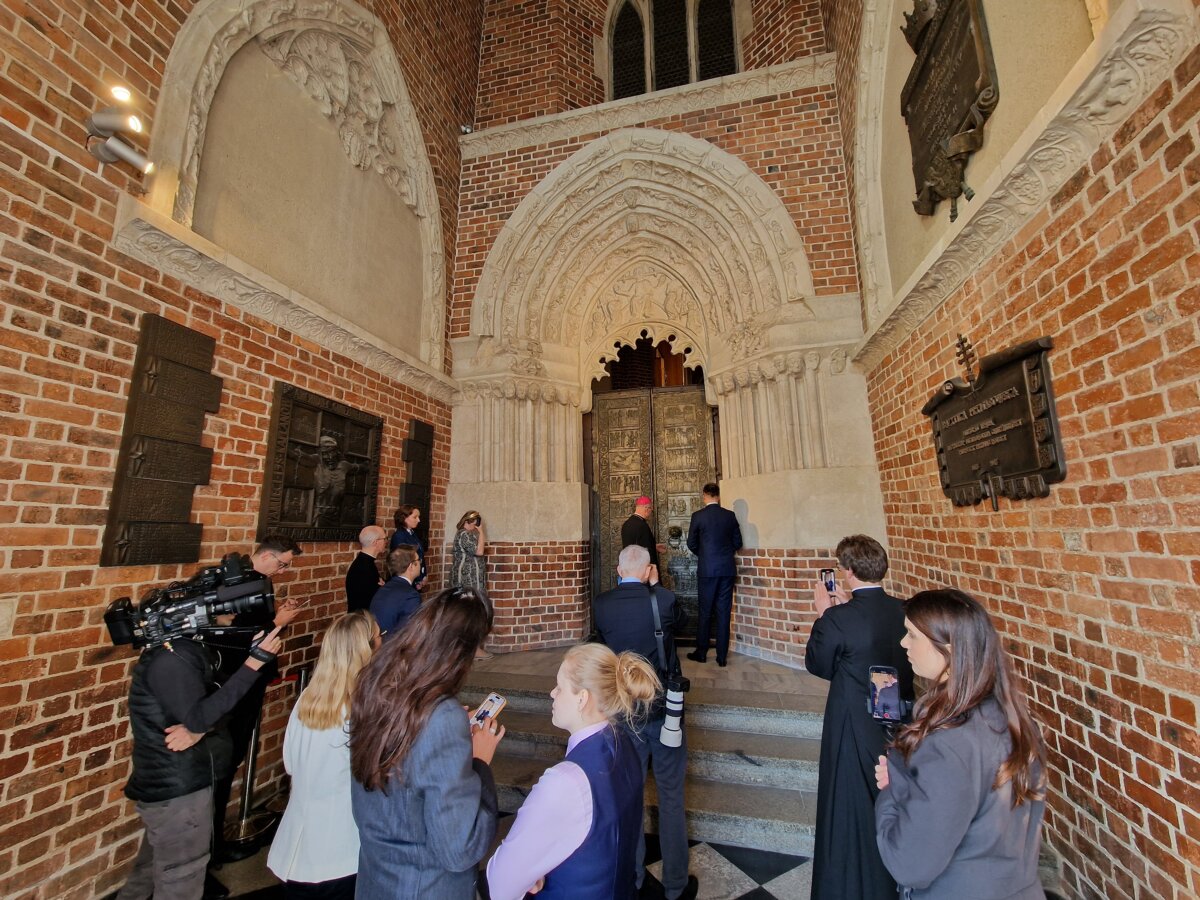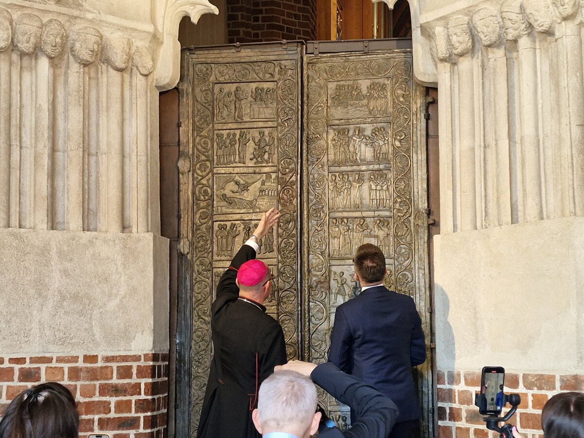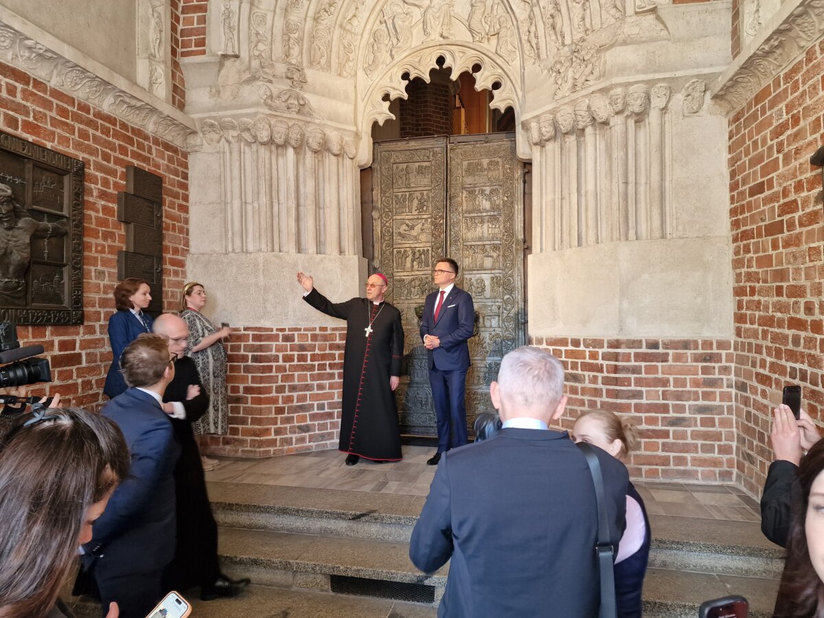 Kolejnym punktem wizyty były drzwi gnieźnieńskie. Tutaj prymas opowiedział o ich znaczeniu dla historiografii Polski i mitu świętego Wojciecha oraz wytłumaczył marszałkowi niektóre sceny z żywota świętego. Po tej rozmowie gospodarz bazyliki oraz marszałek pożegnali się. Prymas poprosił Szymona Hołownię o jego modlitwę także w imieniu arcybiskupa u grobu papieża Franciszka, na którego pogrzeb marszałek jeszcze tego samego dnia się udawał. Wojciech Polak pozostał na czas uroczystości świętowojciechowych w Gnieźnie. – Jestem zbudowany tym, jak sprawnie Kancelaria Sejmu i Senatu zorganizowały to wydarzenie. Myślę, że to było bardzo godne, konkretne i treściwe wydarzenie, na które nasi przodkowie – których przyjechaliśmy tutaj uczcić – mogą patrzeć z satysfakcją. Wierzę, że tak jest – powiedział po zwiedzaniu katedry marszałek. – Oddaliśmy hołd, nie tylko Bolesławowi Chrobremu i Mieszkowi II, ale wszystkim czterdziestu pokoleniom Polek i Polaków, którzy nas poprzedzili. Tym, którzy budowali nasz kraj i państwo. Mam nadzieję, że wynieśliśmy z tego spotkania takie przekonanie, że to nie tylko upamiętnienie, ale też odpowiedzialność. Mówimy tutaj nie tylko pamięci, ale też o przyszłości. Jakie zobowiązania na nas ciążą. Cieszę się z obecności pana prezydenta Gniezna, starosty, wojewody, władz samorządowych, bo to pokazuje, jak bardzo w świadomości mieszkańców Gniezna, jest zakorzenione to źródło naszej wspólnoty. Przed chwilą z księdzem prymasem odwiedziliśmy relikwiarz świętego Wojciecha, grób Radzyma Gaudentego, groby prymasów, relikty rotundy przedromańskiej – to jest relikwia naszej pamięci. To jest miejsce z którego zaczęła się nasza wspólnota i trudno tutaj nie odczuwać wzruszenia stojąc w takim miejscu, kiedy jest się marszałkiem polskiego Sejmu – powiedział lokalnym mediom Szymon Hołownia. Chwilę później spotkał się on z lokalnymi działaczami swojego ugrupowania Polska 2050, z ministrą Pauliną Hennig-Kloską na czele, by po chwili udać się w drogę do Rzymu, na uroczystości pogrzebowe ojca świętego.