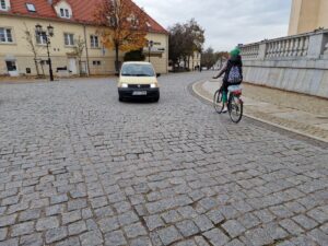 Zgromadzeni uznali to za dobre rozwiązanie. Następnie udano się na Rynek, gdzie zwrócono uwagę na bezpieczeństwo ruchu, które jest tutaj ograniczone. Dzięki oznakowaniu, to piesi mają na łączeniu deptaku z Rynkiem pierwszeństwo ale kierowcy często się do tego nie stosują. Problemem jest też nagminne parkowanie na tym fragmencie centralnego placu miasta. Rozwiązaniem jest – wspominane już, wyłącznie Rynku z ruchu, co wymyślono już w 1997 roku ale ciągle tego nie zrealizowano. Kolejny przystanek – ul. Franciszkańska. Zniszczona nawierzchnia z kostki aż się rozchodzi, a pojedyncze jej elementy można wyciągać bez żadnego problemu. Do tego samochody na chodniku po stronie kościoła. Tutaj też zasugerowano zrobienie z tym porządku. Podobnie na ul. Podgórnej i skrzyżowaniu jej z Tumską. Tu zwrócono uwagę na oznakowanie, z długą listą wyłączeń, które „podpięte” są pod zakazy. Praktycznie nie da się tego zweryfikować – czy samochód, który jedzie Tumską w dół ma do tego prawo?
