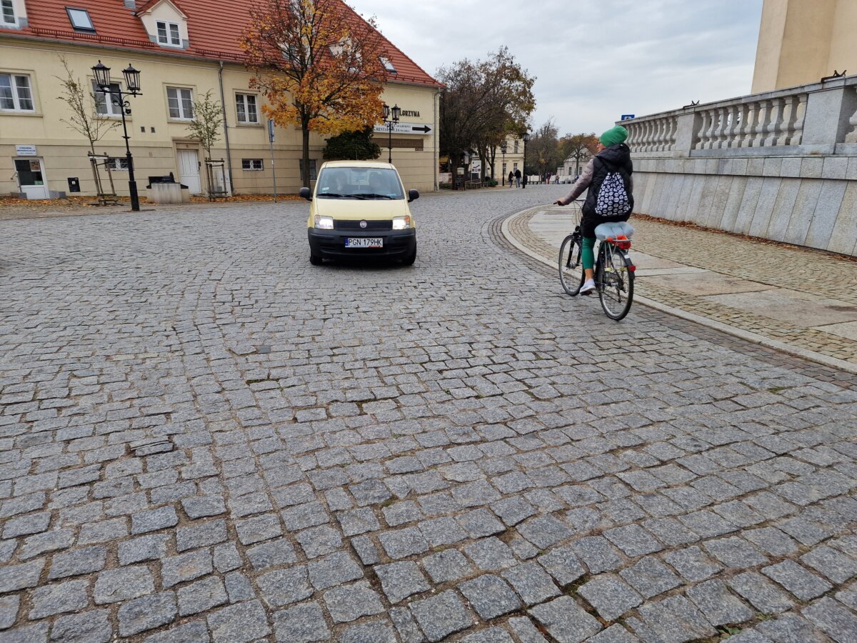 No i miejsce przy samej katedrze. Nieformalny łącznik: Łaskiego – św. Wojciecha. Choć jest tutaj strefa zamieszkania i zakaz ruchu z licznymi wyjątkami, np. przejazdu do Kurii czy Katedry, to znów – nie da się tego wyegzekwować. Bo jak udowodnić, że ktoś nie jedzie do Katedry ale nagle się rozmyślił i pojechał dalej? Z tej dziury prawnej i nieprecyzyjnego oznakowania od lat korzystają kierowcy i bez skrępowania skracają sobie drogę między tymi ulicami, co pozwala im ominąć centrum i kłopotliwe jeżdżenie jednokierunkowymi ulicami jak Jeziorna, Czysta i wiecznie „zapchane” okolice Targowiska. Ale tu znów kłania się stara organizacja ruchu w centrum, która nie przystaje do obecnych czasów. Kierowcy zatem radzą sobie jak mogą i łamiąc prawo, od lat jeżdżą pod katedrą. Prawo jest tutaj ślepe, podobnie jak jego egzekwowanie. I tak wszyscy udają, że wszystko jest w porządku. Podczas wizyty i postoju przy wylocie ul. św. Wojciecha, w zaledwie kilkanaście minut skróciło sobie tutaj drogę aż 19 kierowców! Widok policjantów, strażników miejskich i nawet radiowozu nie zrobiły na nich żadnego wrażenia! Prawo i tak nie jest tutaj egzekwowane. Ale to ma się zmienić. Do 15 grudnia na fragmencie ulicy Tumskiej – między św. Wojciecha i Łaskiego, miasto zamontuje dwie kamery z funkcją automatycznego sczytywania tablic rejestracyjnych. Uszczelnione zostanie też oznakowanie, które ma zezwalać na dojazd do Kurii i ul. Kolegiaty, ale nie do Katedry – co mogło być wykorzystywane przez kierowców. Jeśli pojazd przejedzie między obiema ulicami, jak ma to miejsce dziś – czeka jego kierowcę kara. Po zasięgnięciu opinii Straży Pożarnej i pogotowia – prawdopodobnie u wylotu ulicy św. Wojciecha na okres próbny pojawią się donice z kwiatami. Ma to pomóc w egzekwowaniu prawa na tym fragmencie drogi.