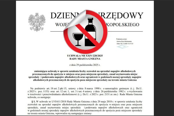 Miejscy radni zadecydowali 29 października, że ograniczą sprzedaż alkoholu w sklepach czy stacjach benzynowych w godzinach 22:00 – 6:00. Do tej pory zakaz obejmował godziny 23:00 – 5:00 i tylko na obszarze osiedla Stare Miasto. Teraz zakaz zostanie rozszerzony na całe miasto w jego granicach administracyjnych. 5 listopada uchwała Rady Miasta Gniezna została opublikowana w Dzienniku Urzędowy…