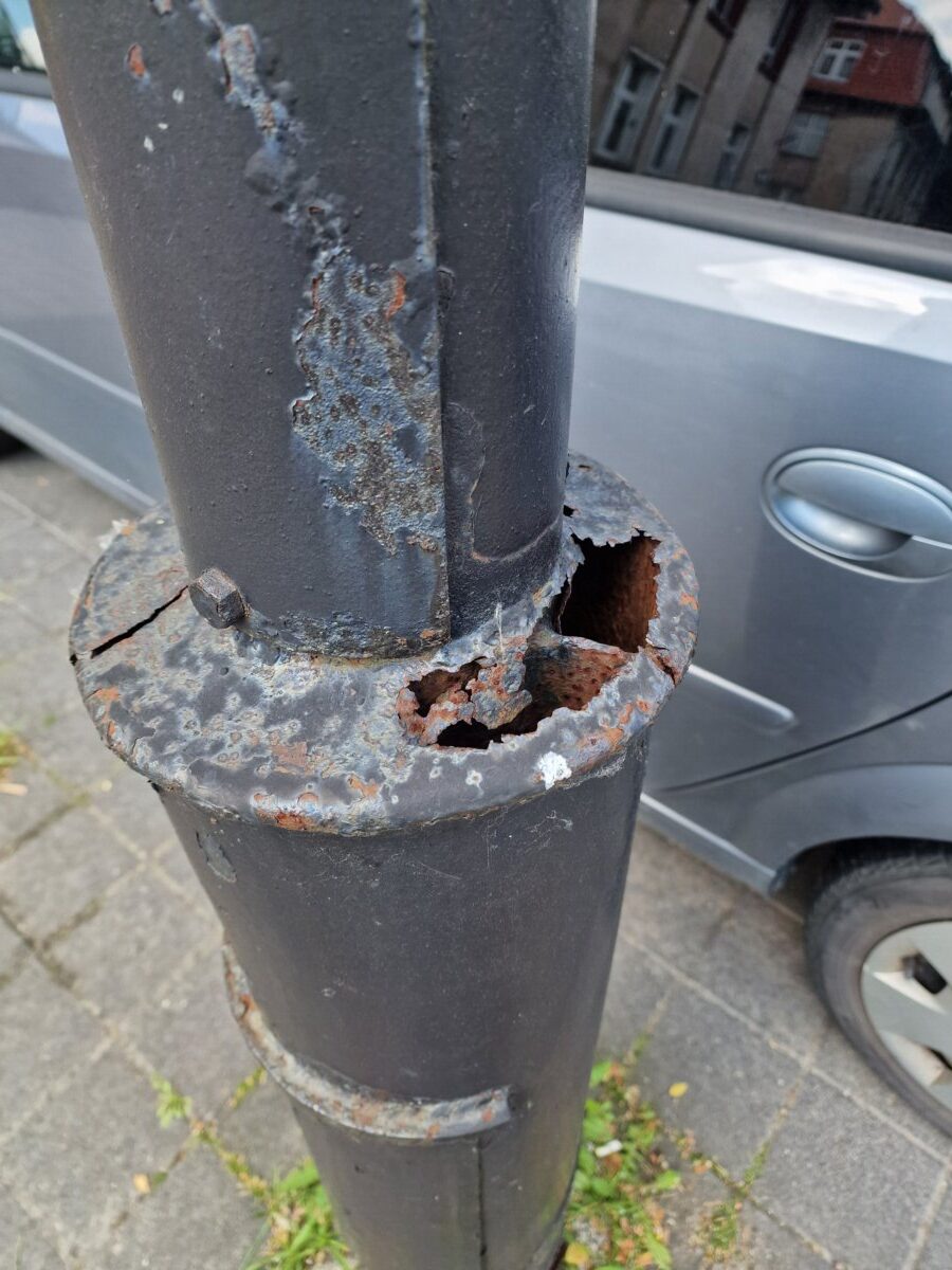 Tak zniszczone słupy znajdziemy bez problemu w śródmieściu Gniezna. Choćby słup latarni przy ul. Jana Pawła II, w pobliżu Policji i Starostwa. Szybki oprawy są matowe od brudu, farba odchodzi z niego płatami, a cokół jest tak skorodowany, że w dziurę można włożyć dłoń. Takich słupów jest w mieście dużo więcej. Na podobną sytuację zwróciła uwagę radna Natasza Szalaty. W interpelacji do prezydenta Gniezna wskazała latarnię na ul. Kaszarskiej. Faktycznie, słup jest skorodowany i z oprawą wychylone są znacznie od pionu. Kolejna lampa za nią, nie prezentuje się wcale lepiej.