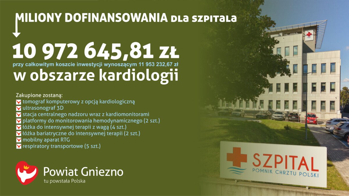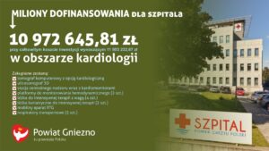 Gnieźnieńska lecznica powiatowa uzyskała dofinansowanie w wysokości 10 972 645,81 zł, przy całkowitej wartości inwestycji wynoszącej 11 953 232,67 zł. Projekt nosi nazwę „Zwiększenie jakości, dostępności i efektywności opieki kardiologicznej poprzez zakup sprzętu medycznego w Szpitalu Pomnik Chrztu Polski w Gnieźnie”. – Szpital planuje unowocześnić zaplecze diagnostyczne i terapeutyczne w obszarze kardiologii. Nowy sprzęt umożliwi szybsze i dokładniejsze diagnozowanie chorób serca oraz skuteczniejsze leczenie pacjentów wymagających intensywnego nadzoru medycznego – poinformował Filip Waligóra, dyrektor Szpitala Pomnik Chrztu Polski w Gnieźnie. Zakupione zostaną: tomograf komputerowy z opcją kardiologiczną, ultrasonograf 3D, stacja centralnego nadzoru wraz z kardiomonitorami, platformy do monitorowania hemodynamicznego (2 szt.),łóżka do intensywnej terapii z wagą (4 szt.), łóżka bariatryczne do intensywnej terapii (2 szt.),mobilny aparat RTG, respiratory transportowe (5 szt.). Jak dodaje dyrektor szpitala, otrzymane pieniądze muszą być wykorzystane do końca czerwca przyszłego roku.