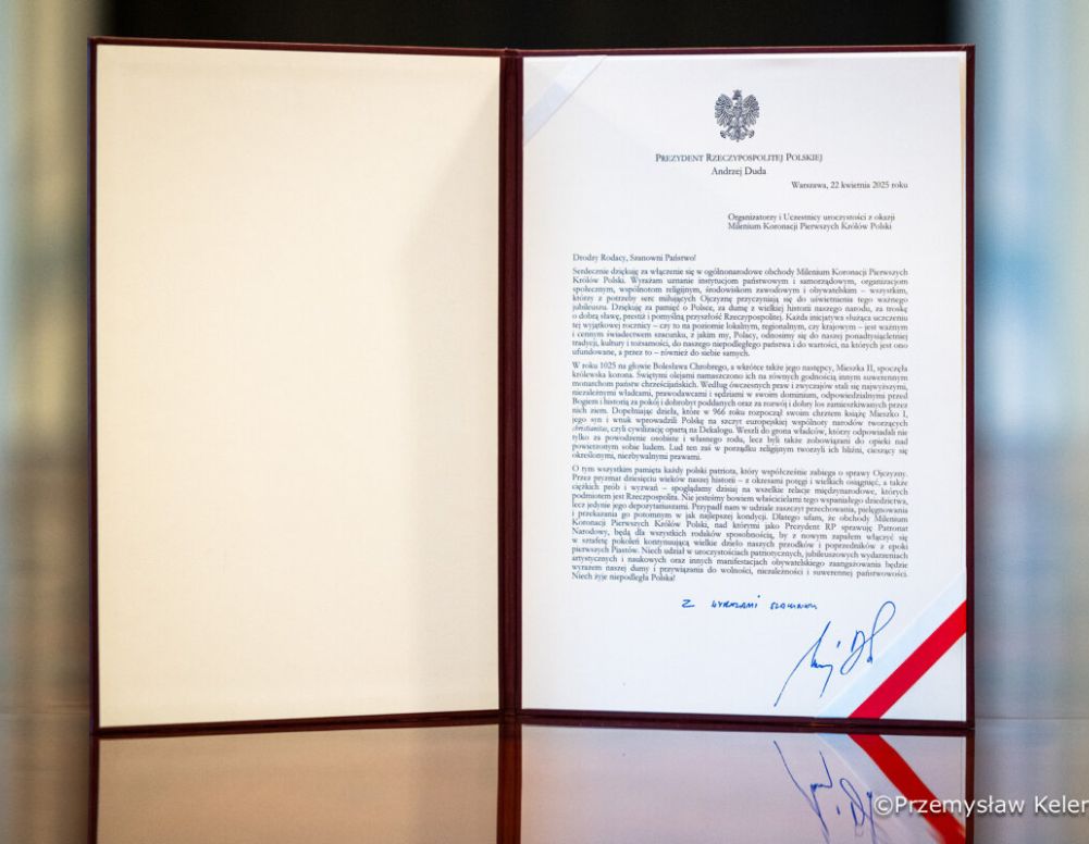 Serdecznie dziękuję za włączenie się w ogólnonarodowe obchody Milenium Koronacji Pierwszych Królów Polski. Wyrażam uznanie instytucjom państwowym i samorządowym, organizacjom społecznym, wspólnotom religijnym, środowiskom zawodowym i obywatelskim – wszystkim, którzy z potrzeby serc miłujących Ojczyznę przyczyniają się do uświetnienia tego ważnego jubileuszu. Dziękuję za pamięć o Polsce, za dumę z wielkiej historii naszego narodu, za troskę o dobrą sławę, prestiż i pomyślną przyszłość Rzeczypospolitej. Każda inicjatywa służąca uczczeniu tej wyjątkowej rocznicy – czy to na poziomie lokalnym, regionalnym, czy krajowym – jest ważnym i cennym świadectwem szacunku, z jakim my, Polacy, odnosimy się do naszej ponadtysiącletniej tradycji, kultury i tożsamości, do naszego niepodległego państwa i do wartości, na których jest ono ufundowane, a przez to – również do siebie samych.