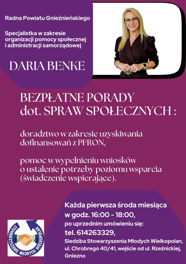 Od wielu lat w siedzibie Stowarzyszenia Młodych Wielkopolan prowadzone są bezpłatne porady dla osób szukających pomocy, m.in. porady prawne, czy wsparcie w zakresie rozliczeń PIT. Od zeszłego tygodnia zakres doradztwa został poszerzony o porady dotyczące spraw społecznych, które prowadzi Daria Benke, specjalistka w zakresie organizacji pomocy społecznej oraz członkini Zarządu Powiatu Gnieźnieńskiego. Jej doświadczenie i praktyczna wiedza mają pomóc mieszkańcom w sprawnym poruszaniu się po procedurach urzędowych i systemie świadczeń.