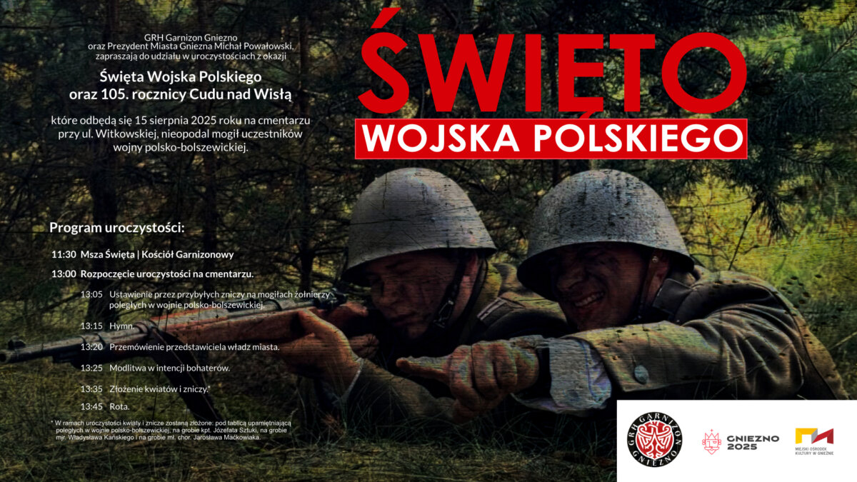 W najbliższy piątek, 15 sierpnia przypada 105. rocznica Cudu nad Wisłą, Święto Wojska Polskiego. Miasto Gniezno, jako partner przedsięwzięcia, w imieniu organizatora – Grupy Rekonstrukcyjno-Historycznej Garnizon Gniezno – zachęca do oddania hołdu poległym, szczególnie w tak trudnym, także dla naszego kraju, momencie konfliktu zbrojnego za naszą wschodnią granicą.