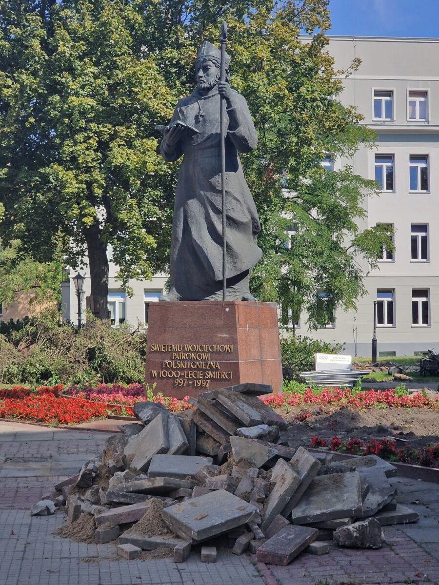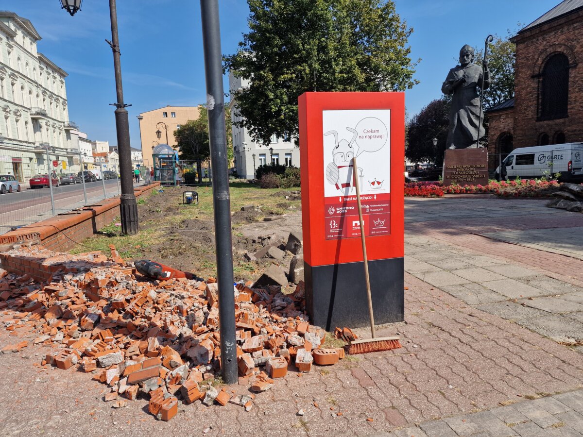 Koło dorodnego i charakterystycznego kasztanowca, który daje cień sąsiedniemu pomnikowi świętego Wojciecha – patrona miasta, sprawnie uwija się mała wywrotka, która rozwozi rozebrane przed chwilą murki i płyty na skwerze przy ul. Łubieńskiego. Przez płot z ciekawością przyglądają się pracom liczni gnieźnianie oczekujący na swoje autobusy. To ścisłe centrum miasta i jeden z głównych punktów wymiany pasażerskiej. I już choćby z tej przyczyny powinien on być funkcjonalny i mieć estetyczny wygląd. Jak zapewnia Michał Powałowski, prezydent miasta, tak właśnie się stanie. 4 września wizytował on budowę i spotkał się z dziennikarzami. – To miejsce zawsze było zielone i chcemy, by było jeszcze bardziej zielone – zapewnił włodarz miasta. Jak dodał, cały skwer zostanie na nowo zaaranżowany, a pasażerowie MPK odczują poprawę komfortu oczekiwania na transport. Nie dość, że powstanie nowa estetyczna wiata autobusowa, to będzie ona jeszcze oświetlona i będzie posiadać publiczną toaletę. – Nowe ścieżki będą przepuszczać do gleby wodę opadową, a przy wiacie będzie zbiornik, który tę wodę zbierze i rozprowadzi do nawadniania zieleńca. To tzw. „mała retencja” – wymienia rozwiązania, które będą tu zastosowane prezydent. Do tego pojawi się nowa mała architektura. – Będzie to nowa wizytówka miasta – zachwala projekt M. Powałowski.