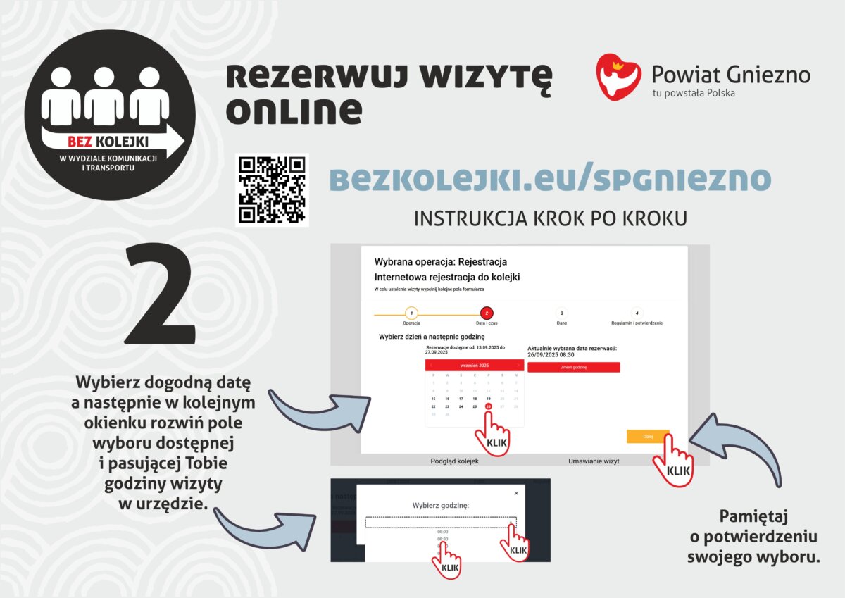 W Starostwie Powiatowym w Gnieźnie przygotowano następne udogodnienie dla osób korzystających z usług Wydziału Komunikacji. Dzięki uruchomieniu dedykowanej e-usługi każdy swoją wizytę w urzędzie może zarejestrować online. Sprawy dotyczące prawa jazdy, rejestracji pojazdu, zgłoszenia zbycia lub odbiorem dowodu rejestracyjnego można załatwić bez zbędnego czekania w kolejce.
