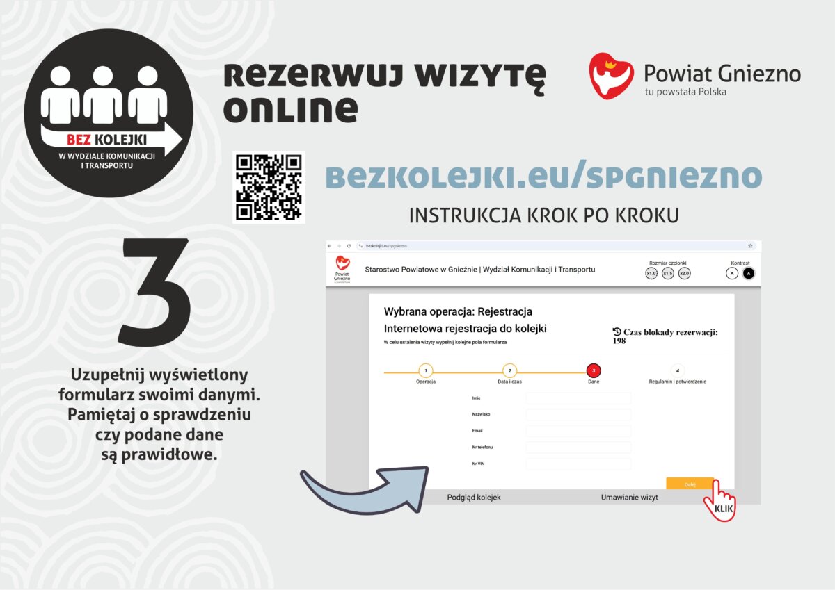 To kolejny krok w celu unowocześnienia Wydziału Komunikacji i Transportu, bardziej przyjaznej administracji. – Po uruchomieniu urzędomatu, który spotkał się z bardzo dobrym odbiorem klientów starostwa – bowiem za jego pośrednictwem wydaliśmy już ponad 3 tysiące dowodów rejestracyjnych – dziś promujemy nowy system kolejkowy online – informuje Ewa Barłoga-Purol, członek Zarządu Powiatu Gnieźnieńskiego i dodaje: – To bardzo proste, wręcz intuicyjne narzędzie, które krok po kroku przeprowadzi naszych klientów przez internetową rezerwację wizyty. Nie zapominajmy oczywiście o wprowadzonym w międzyczasie dodatkowym sposobie płatności za pomocą BLIKa, który uzupełnia oferowany w wydziale wachlarz e-usług.