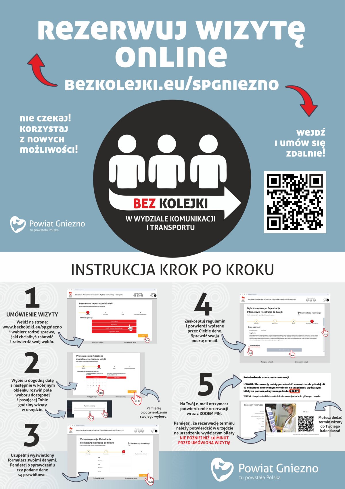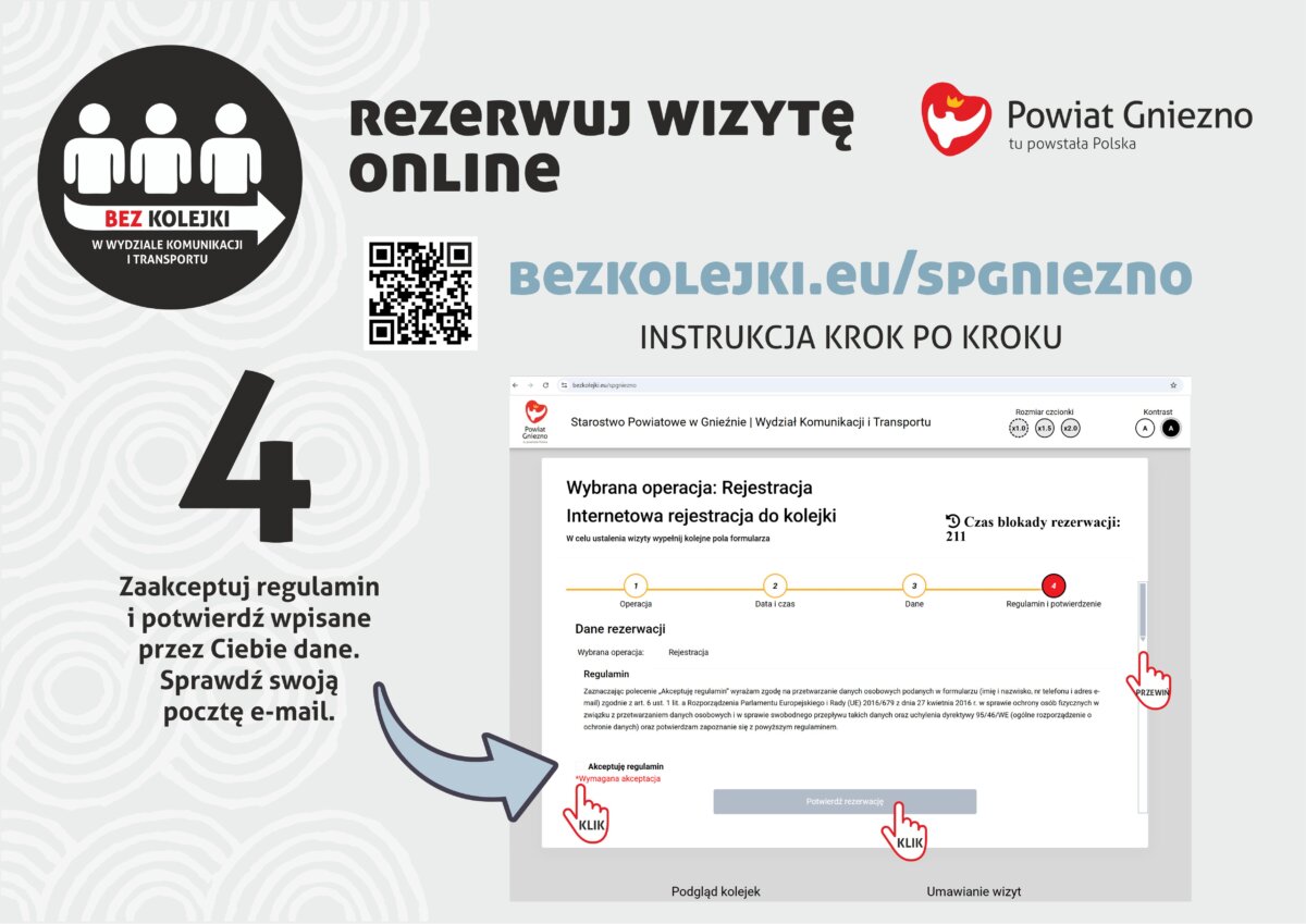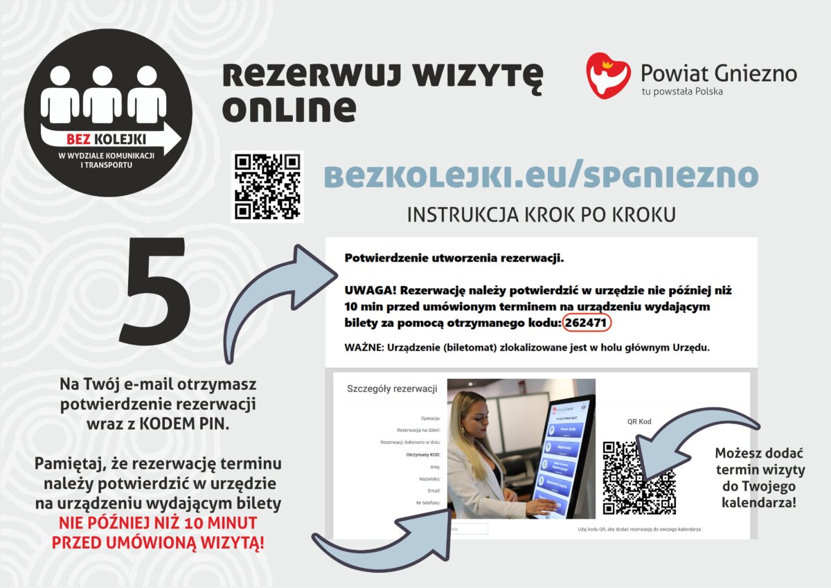 Jak skorzystać z nowej e-usługi? – Na dedykowanej stronie internetowej www.bezkolejki.eu/spgniezno klient wybiera interesujący go rodzaj sprawy, datę oraz godzinę wizyty w urzędzie. Na podany w formularzu adres email otrzymuje potwierdzenie dokonania rezerwacji oraz kod PIN – wyjaśnia Robert Bazułka, dyrektor Wydziału Komunikacji i Transportu. – W dniu umówionej wizyty należy potwierdzić rezerwację w biletomacie przy Wydziale Komunikacji i Transportu nie później niż 10 minut przed umówionym terminem. Wizytę potwierdzamy za pomocą otrzymanego kodu PIN. O umówionej godzinie system kolejkowy w holu głównym urzędu wywołuje klienta do stanowiska – dodaje dyrektor R. Bazułka.