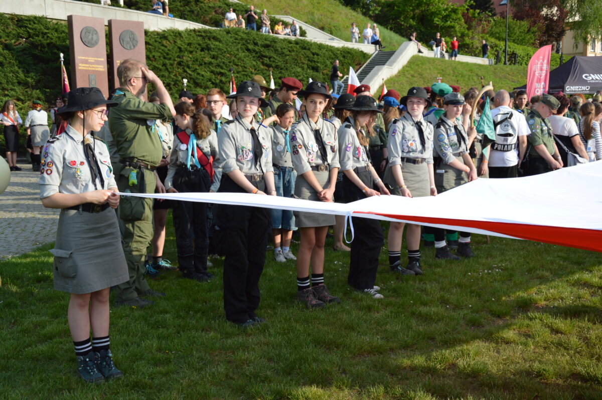 W gnieźnieńskim Święcie Flagi udział wzięli harcerze, którzy uczestniczą w Zlocie Chorągwi Wielkopolskiej Związku Harcerstwa Polskiego, i to oni ponieśli stumetrową, biało – czerwoną flagę. W uroczystym przemarszu, który wyruszył z parkingu przy ul. Sobieskiego, przeszli ulicami miasta, by finalnie dotrzeć na plac św. Wojciecha. Na uwagę zasługuje także obecność pocztów sztandarowych, reprezentujących szkoły im. Bolesława Chrobrego z terenu całego kraju. W pochodzie udział wzięli także przedstawiciele władz samorządowych z Gniezna i powiatu gnieźnieńskiego. Po drodze dołączali mieszkańcy.