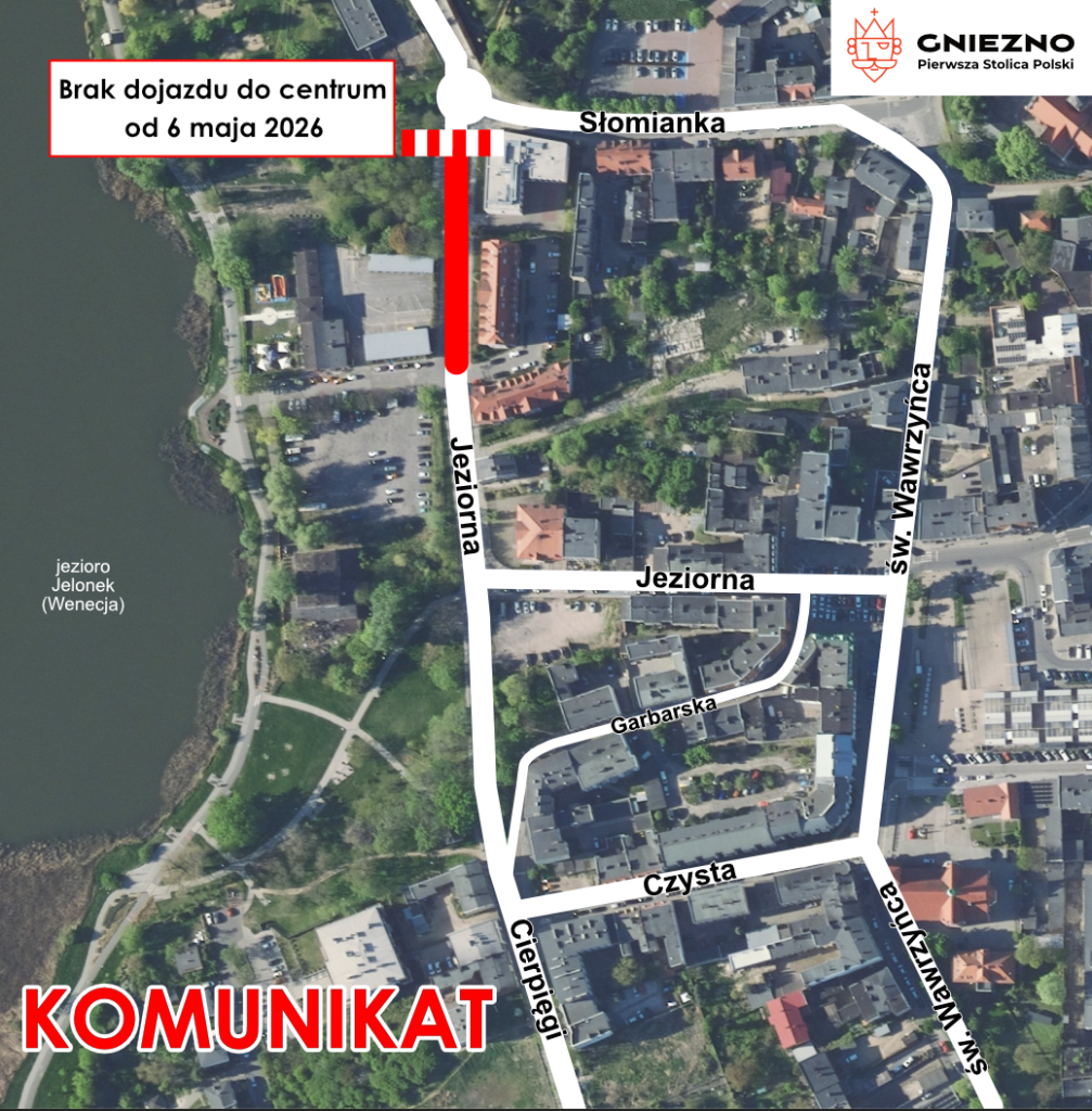 Od 6 maja zostanie wprowadzona tymczasowa organizacja ruchu na ul. Jeziornej w Gnieźnie w związku z budową kanalizacji deszczowej obejmującej rejon Jeziora Jelonek oraz ulic: Jeziornej, Słomianka, Łaskiego i Tumskiej. Zadanie obejmuje również budowę zielonego skweru przy ul. Słomianka oraz odtworzenie nawierzchni po zakończeniu robót.
