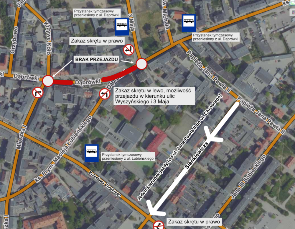 25 lutego (wtorek) zamknięty zostanie odcinek ulicy od 3 Maja do Mieszka I (bez skrzyżowania Mieszka I i Krzywe Koło), ale z możliwością wyjazdu z ul. Łubieńskiego w kierunku 3 Maja i Wyszyńskiego. Od tego dnia kursy autobusów MPK będą mieć zmienione trasy i lokalizacje przystanków: na ul. Wyszyńskiego (na wysokości kościoła św. Michała) oraz na 3 Maja (na wysokości sklepu Mal-lak). W celu umożliwienia objazdu autobusów MPK na ulicy Sienkiewicza zostanie wprowadzonych ruch jednokierunkowy od ulicy Jana Pawła II do ulicy Chrobrego.