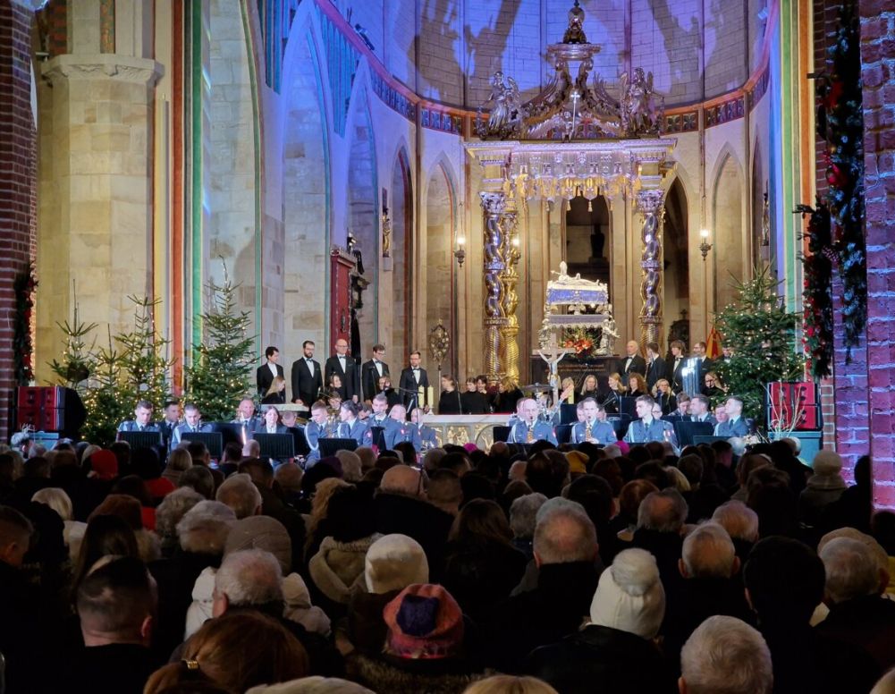 W sobotę 4 stycznia do gnieźnieńskiej bazyliki archikatedralnej przybyło ok. 800 osób – zaproszonych gości i mieszkańców Gniezna, by wspólnie radosnym koncertem rozpocząć jubileuszowy rok. Dla zebranych, w transmitowanym na żywo w Telewizji Polskiej wydarzeniu, wystąpiła Orkiestra Reprezentacyjna Sił Powietrznych im. Karola Kurpińskiego pod batutą ppłk. Pawła Joksa. Żołnierzy wsparł Chór Kameralny Dysonans prowadzony przez prof. Magdaleną Wdowicką-Mackiewicz oraz soliści: Joanna Horodko i Marcin Wojciechowski. O podniosłości chwili i całego 2025 roku mówił tuż przed koncertem abp Wojciech Polak, Prymas Polski. – Ważnym wydarzeniem dla Gniezna i dla Polski jest tysięczna rocznica koronacji królewskich Bolesława Chrobrego i Mieszka II Lamberta, wraz z królową Rychezą. Początek roku nie tylko przypomina nam o tych wydarzeniach, ale budzi też w sercach wdzięczność. Dlatego rozpoczynamy ważnym wydarzeniem muzycznym te obchody, bo jest to dla nas radość. To też pokazuje, że w różnych wymiarach, narodziny królestwa rodzą i rodziły błogosławione owoce – stwierdził metropolita gnieźnieński.