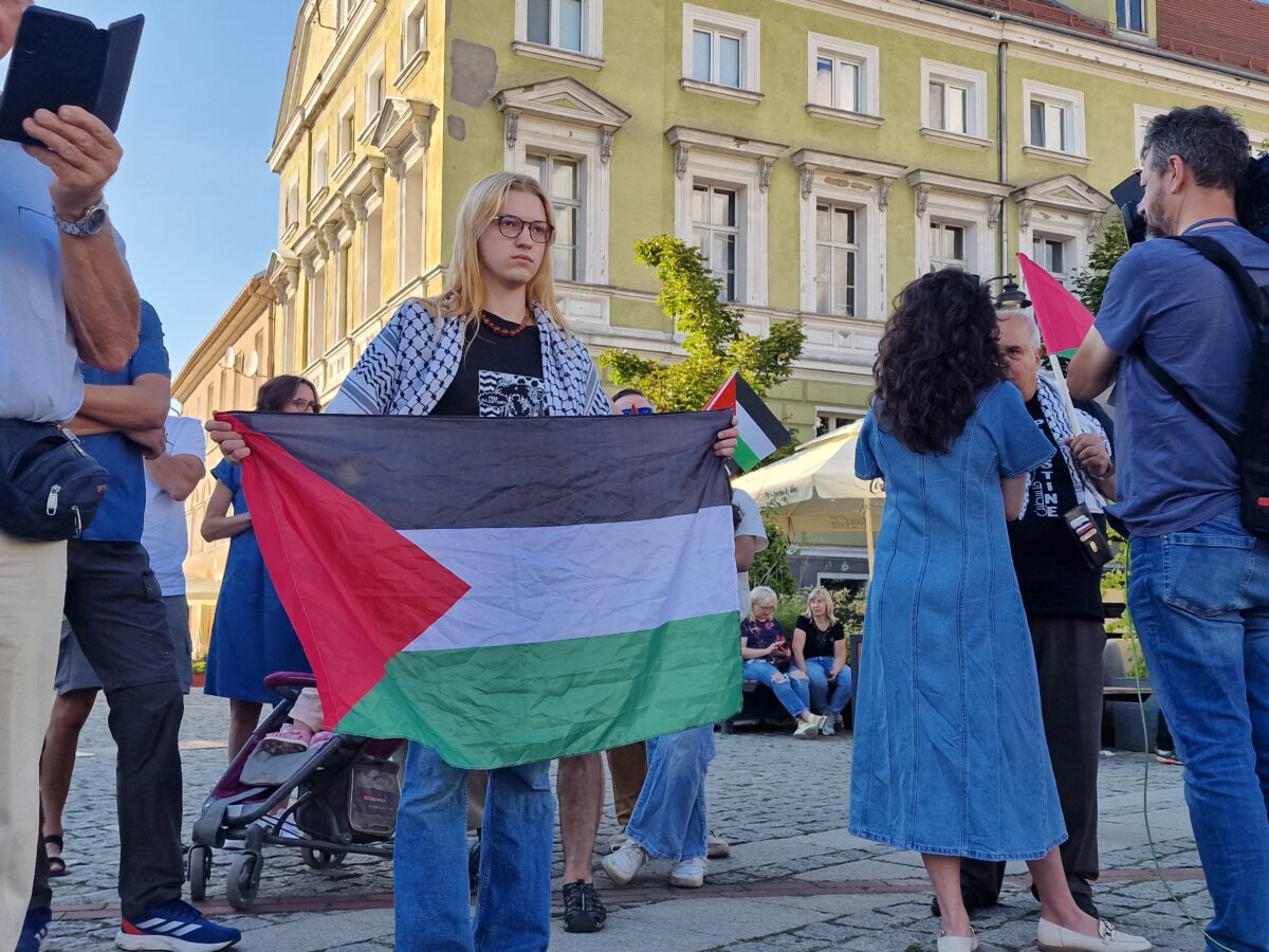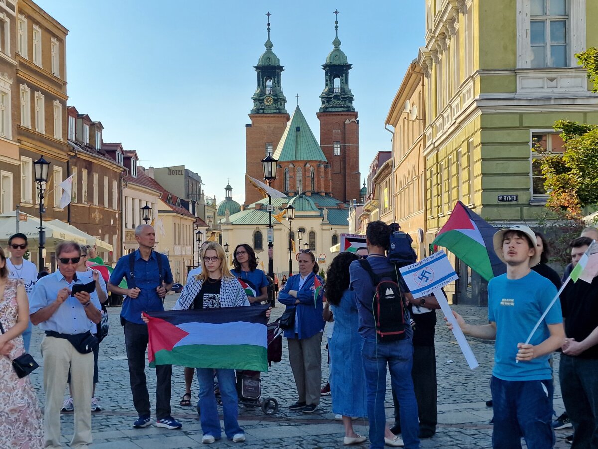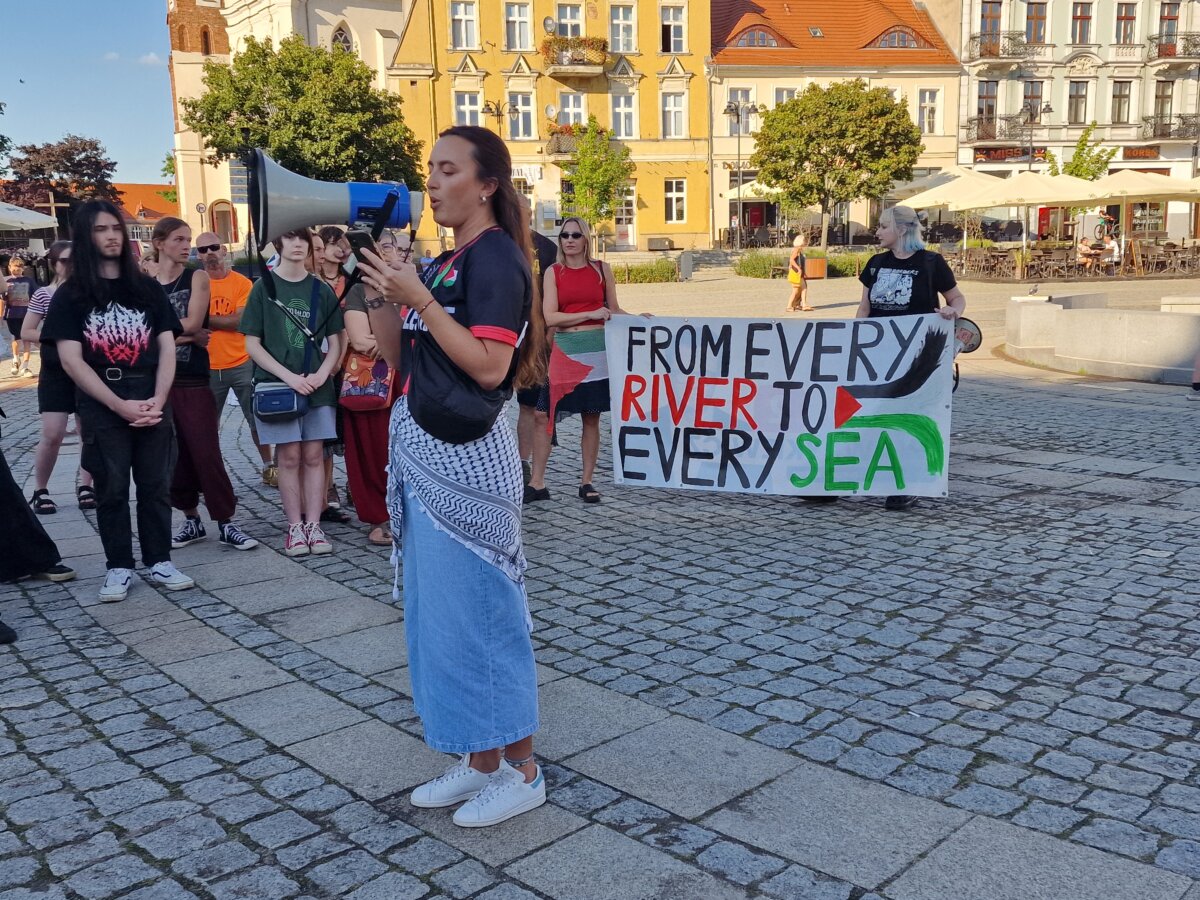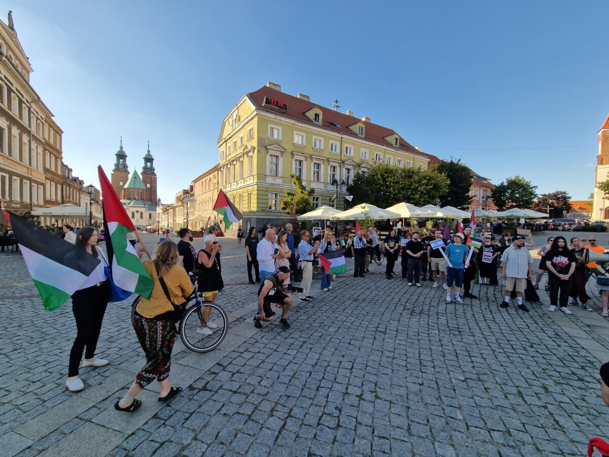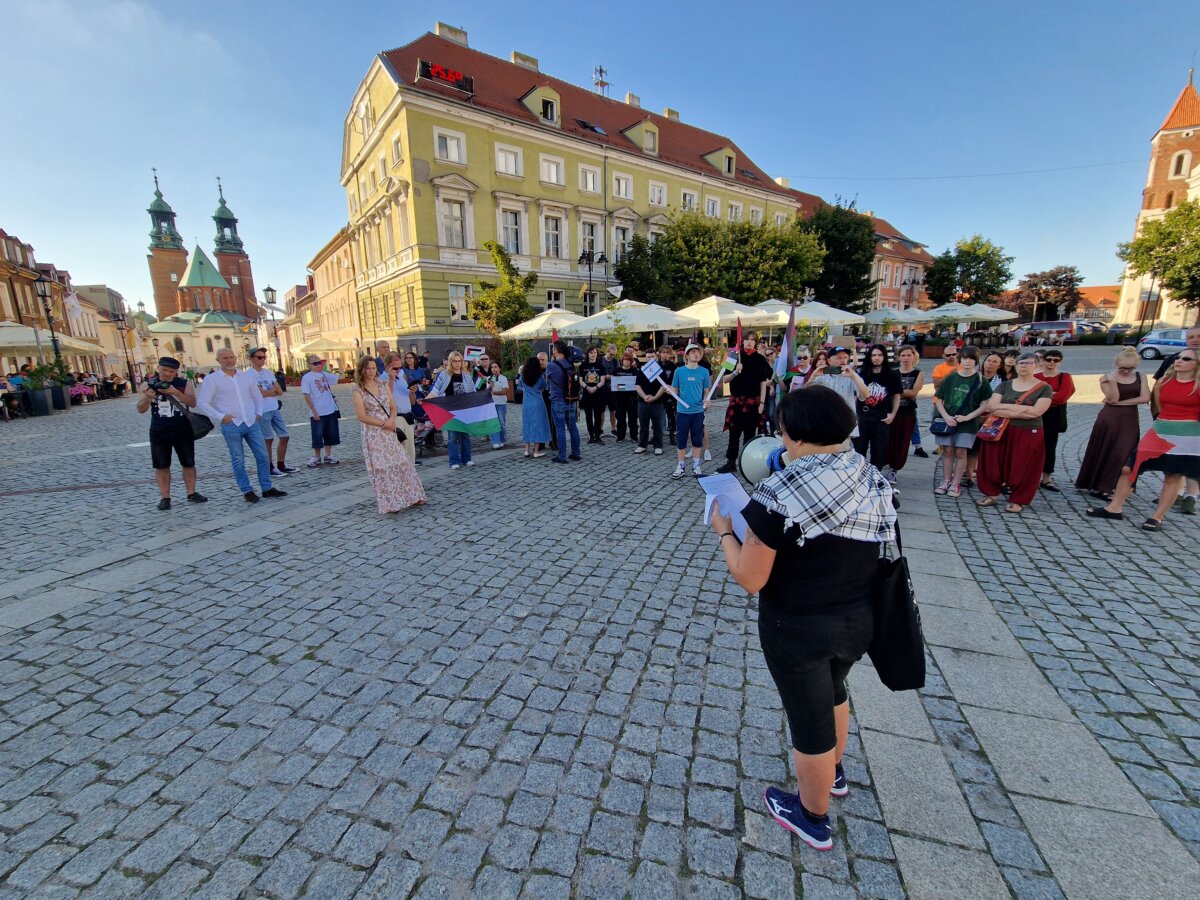 To jedyne takie wydarzenie w przestrzeni Gniezna, kiedy publicznie ok. 60 osób postanowiło zamanifestować swój sprzeciw przeciwko krzywdzie i ludobójstwie, które dzieją się od miesięcy w Palestynie. „»Nie bądźcie obojętni! Bo znów jakieś Auschwitz spadnie wam z nieba« – powiedział w swoim słynnym przemówieniu dziennikarz, historyk i polski Żyd Marian Turski, który przeżył Auschwitz. Dziś podobny Holokaust, autorytarne państwo Izrael czyni Palestynie. Dlatego w Pierwszej Stolicy i królewskim mieście Gnieźnie także nie bądźmy obojętni! Chodźmy symbolicznie wyrazić niezgodę na trwającą wojnę i ludobójstwo, ale też okazać solidarność Palestynkom i Palestyńczykom” – zapraszali na wydarzenie organizatorzy. Wiec odbył się w ostatni dzień wakacji, na gnieźnieńskim Rynku. Gnieźnianie przygotowali transparenty oraz przynieśli flagi Palestyny. Wsparcie przywieźli też studenci z poznańskiego UAM zrzeszeni w inicjatywie „Students for Justice in Palestine” oraz „Poznań dla Palestyny”. „Jesteśmy przerażone postawą polityków, którzy nie tylko nie zatrzymują tego zła, ale również układają się z nim, jak gdyby nigdy nic” – mówiła jedna z uczestniczek manifestacji. Głos zabierali organizatorzy oraz zwykli gnieźnianie. Nie był to cichy protest, lecz głośny i pełen przejmujących spostrzeżeń i wypowiedzi krzyk ludzi. Do manifestacji spontanicznie przyłączali się też licznie odwiedzający tego dnia miasto turyści. Jak podkreślali organizatorzy – „żyjemy w czasach bezwstydu, chwilowego »fejmu« w socialmediach oraz postprawdy, czyli zachowań osłabiających znaczenie prawdy, gdzie na skomplikowane problemy globalizmu, kapitalizmu, nierówności czy braku wiedzy, rzuca się populistyczne hasła i polaryzuje społeczeństwo na całym świecie” – mówiła o przyczynie potrzeby organizacji manifestacji Kamila Kasprzak-Bartkowiak z Klubu Krytyki Politycznej.